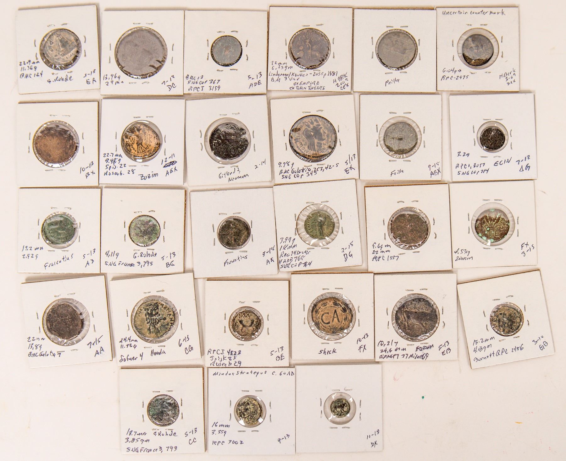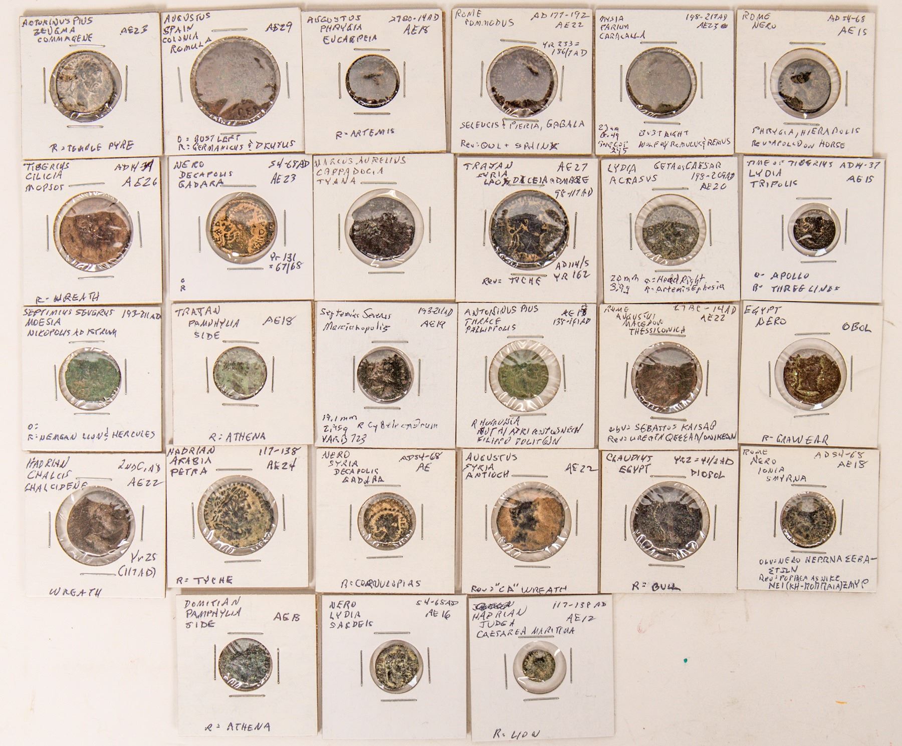 28 Roman bronzes from Augustus to Philip I. Augustus (2), Claudius, Germanicus, Tiberius, Nero (6), Titus, Domitian, Hadrian (3), Antonius Pius (4), Marcus Aurelius, Commodus, Lucius Verus, Septimus Serverus (2), Gordian IV, Trajan Decius, Philip I. Mostly provincial.