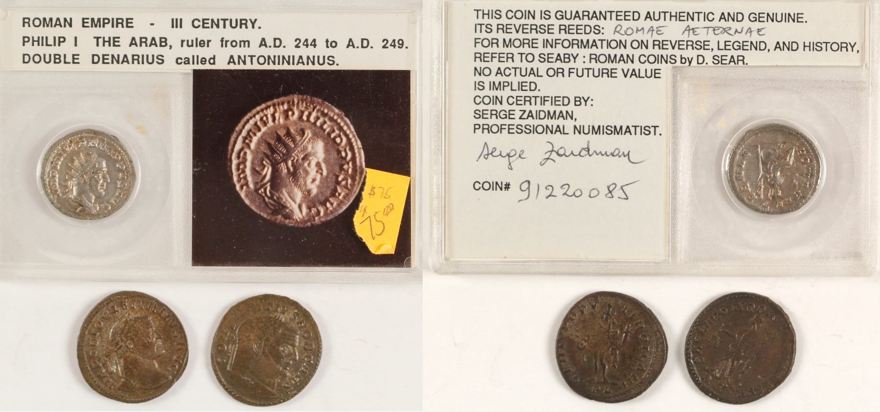 One coin encased with photo and authenticity: Double Denarius called Antoninianus, Obverse: Phillip l The Arab. Reverse: "Roman Empire." The features on both sides are very discernible. This coin is certified by Serge Zaidman, Professional Numismatist. Coin # g1220085.