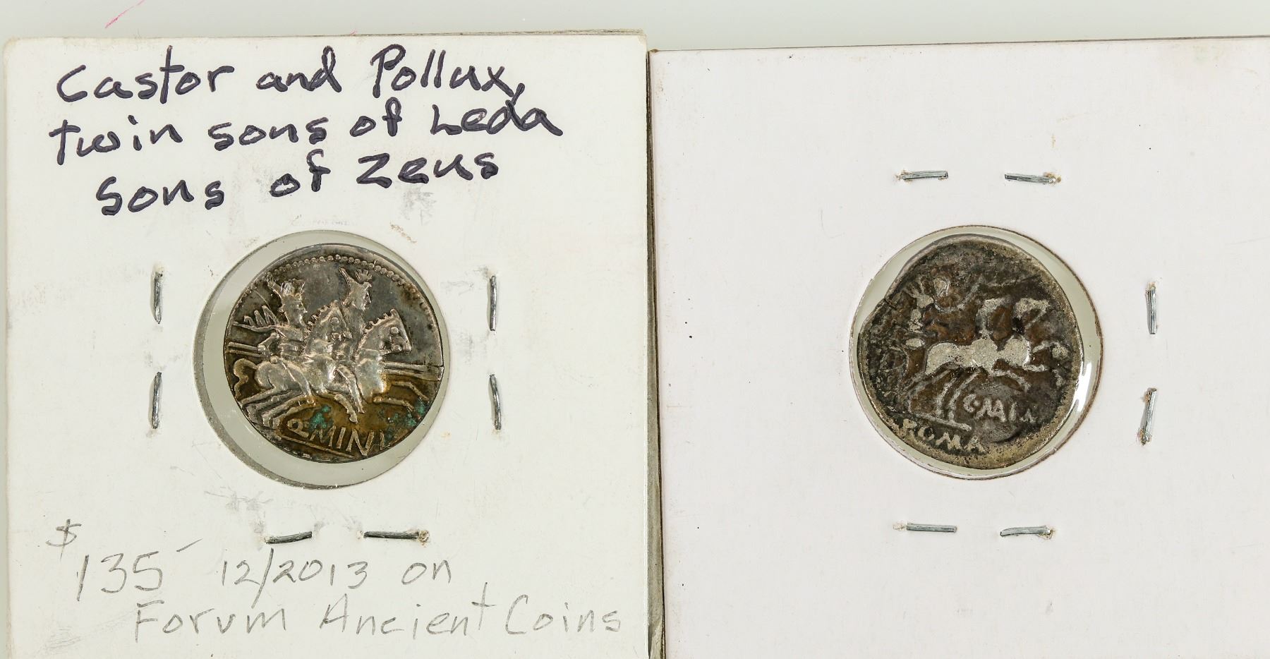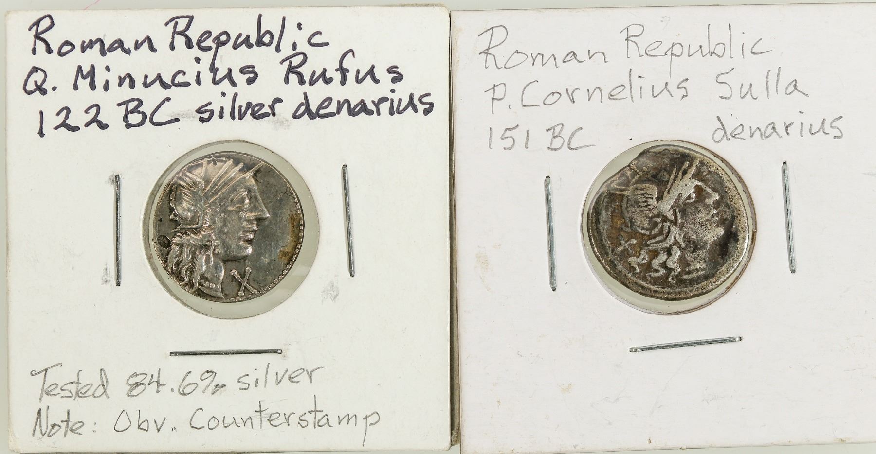 Two Republican Denarius: 1) Minucius Rufus (122 BC); rev.: Castor and Pollux, Sons of Zeus. 2) Cornelius Sulla (151 BC).