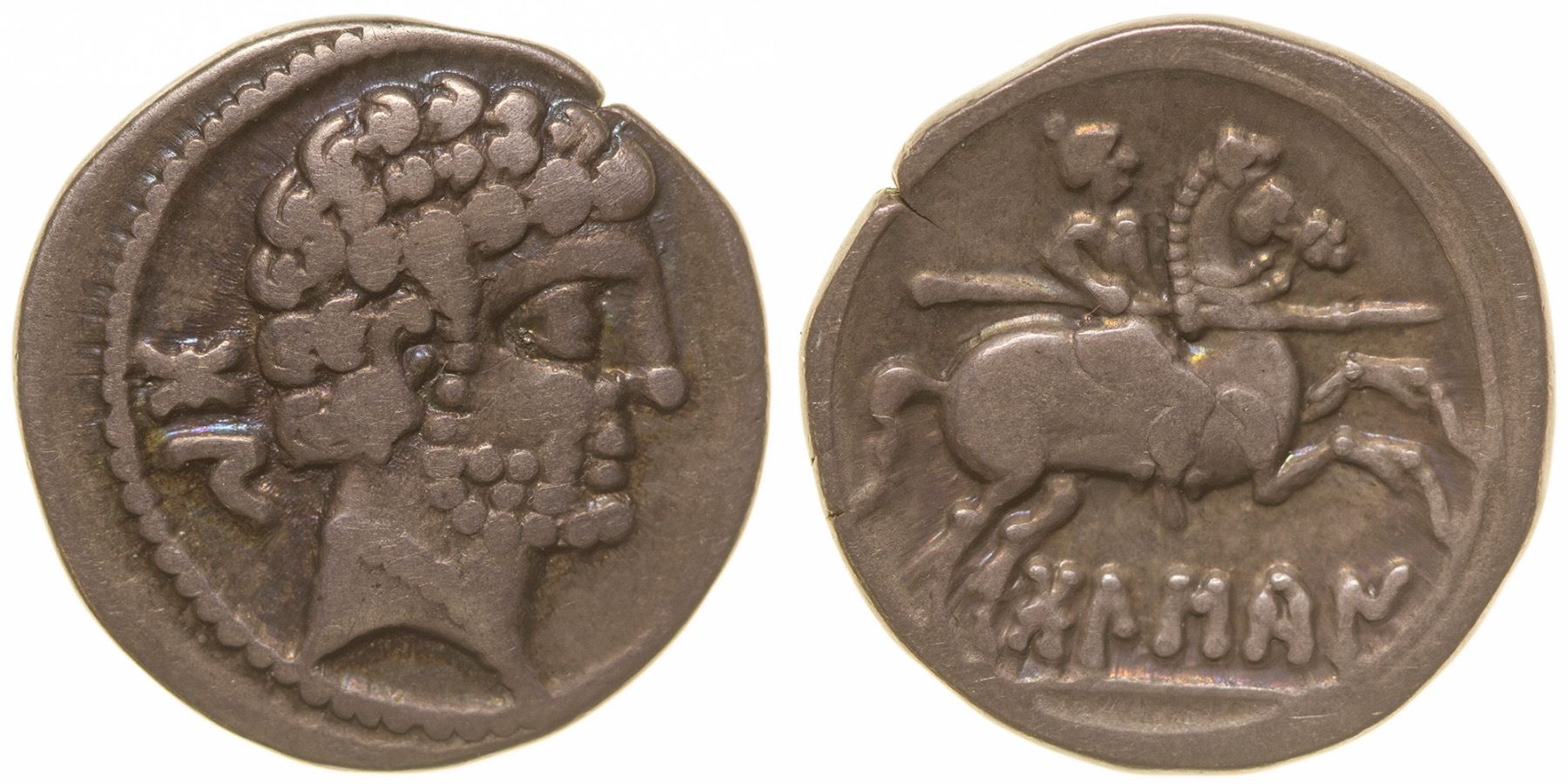 Silver drachm with head on obverse and horseman galloping on reverse. HWAC# 61062 Date: Location: