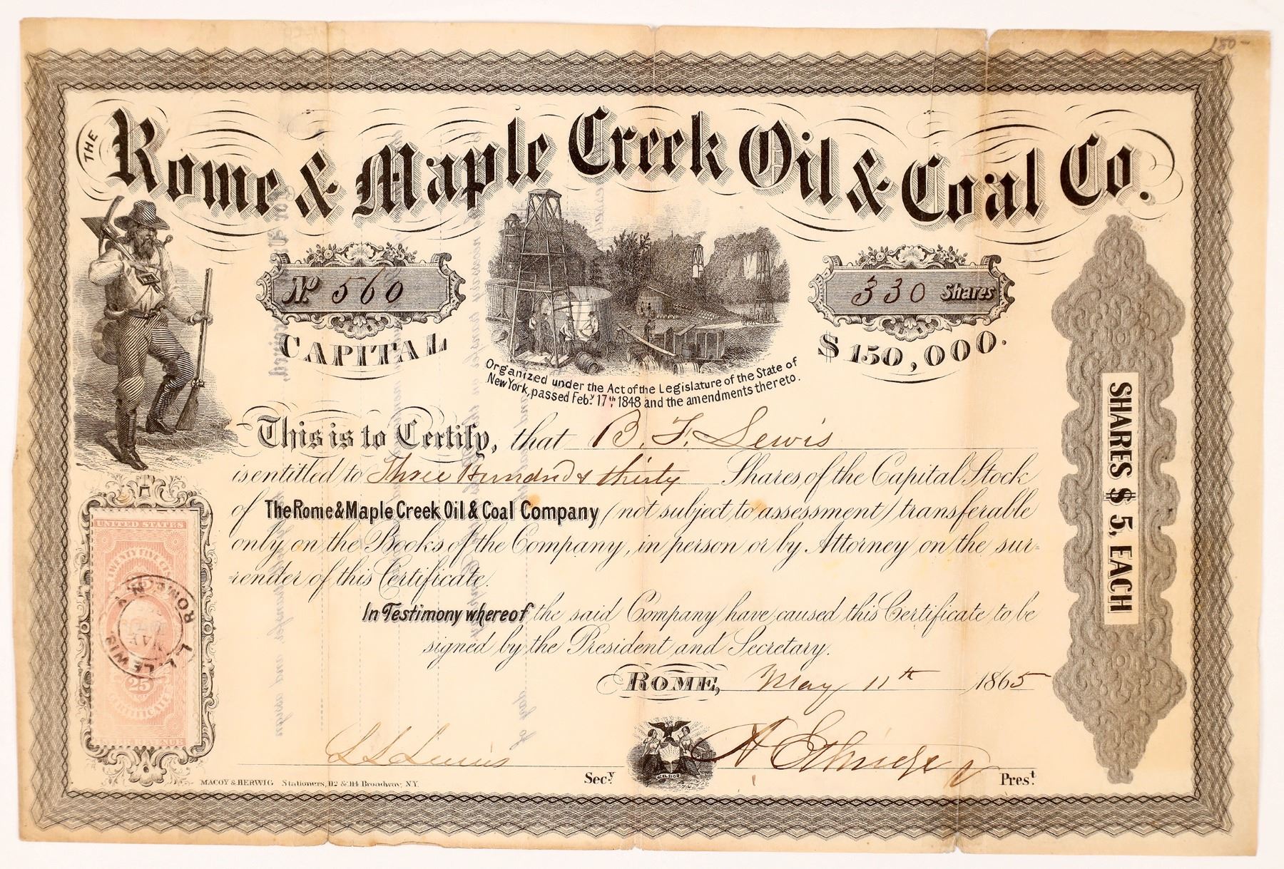 Organized in New York. No. 560, issued for 330 shares to BF Lewis in Rome, 1865. Signed by the vice president and secretary LL Lewis. Not cancelled. Two vignettes: prospector with rifle (left) and oil operations (center). Printed by Macoy & Herwig, NY. 25 cent US IR adhesive revenue stamp attached at the bottom left. Heavy toning, tape repaired separations. 6.75 x 10.25" No additional information located, though a Maple Creek Coal mine was located in Washington County, Pennsylvania.