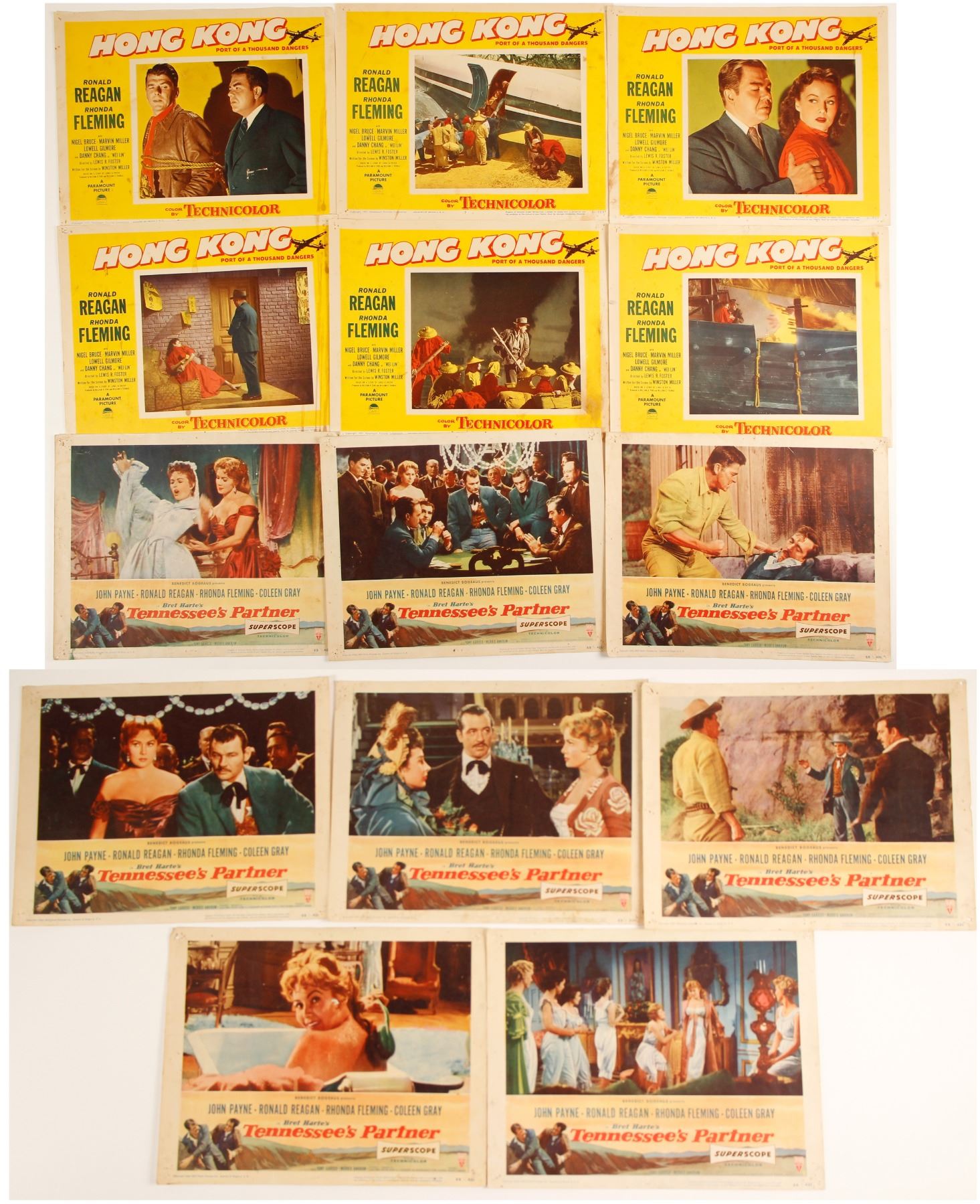 14 movie lobby cards: Six feature a 1952 international crime drama "Hong Kong", starring Ronald Reagan, Rhonda Fleming and Nigel Bruce. The remaining eight cards tout the 1956 western "Tennessee's Partner" with John Payne, Ronald Reagan, Rhonda Fleming and Coleen Gray; The cards are the standard 14" x 11" with some light staining, pin holes in upper & lower corners from displaying on wall, please inspect.