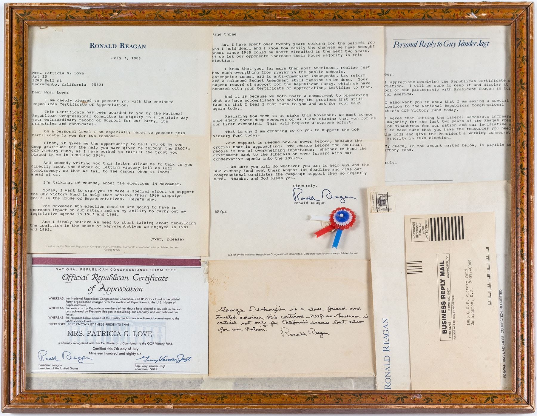 Assortment of a signed letter, 2 covers, personal reply, certificate of appreciation, and a personal hand written and autographed note. Framed and measures 17" x 21". State: City: HWAC#: 38502 Date: