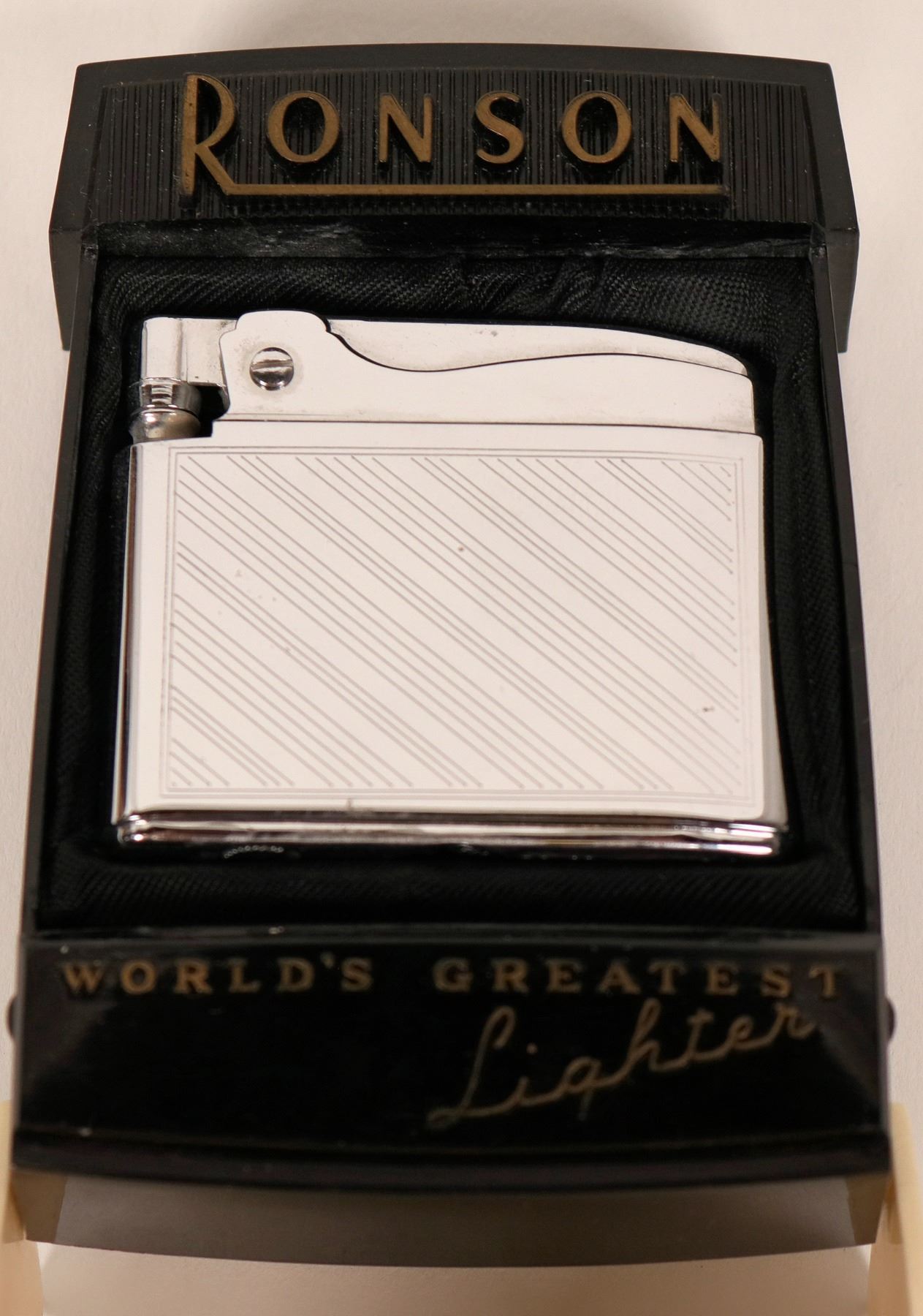 Ronson lighter company began as The Art Metal Works in 1897 led by Hecht, Herzig, and Aronson. Louis V. Aronson's creativity produced a wide variety of products, including those using new plating techniques he developed. Aronson also invented a matchstick that used no white phosphorus, winning an international competition in doing so. The company had become known as Ronson by the 1970s, when it struggled with competition and portions of the company were sold off. Today in the United States, Ronson-branded lighters are made by Zippo. This chrome-plated lighter appears to be in new, unused condition in the original black and ivory-colored plastic container. The Adonis design strikes a spark and lights the wick in one motion without requiring a cover to be opened first. Releasing the lighter extinguishes the flame and covers the wick. See photo for condition and design details.