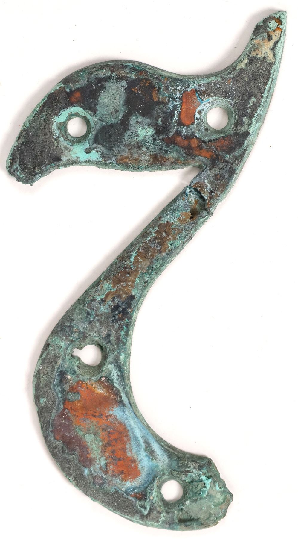 We believe these two plates to form either the number "2" or "7" to label a room on the ship. Curved metal plate with two .25-inch beveled screw holes, 1.5 inches apart. Overall length 2.5 inches x 1/8 inch thick. Heavy degradation near screw hole on the tip. Tapered end has broken metal. The smaller plate also has two beveled screw holes, 1.25 inches apart with 2.5inch screw holes, overall length 4 inches. Two of the three end pieces have heavy degradation. Both pieces possibly ferrous in origin.
