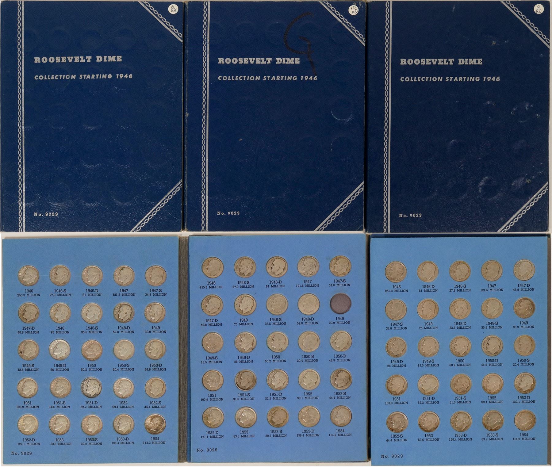 Lot of three blue Whitman No. 9029 albums: 1) 41 coins, 1946-1961; missing the 1954-S; VF-AU condition. 2) 44 coins, 1946-1963, missing 1949, VF-AU condition. 3) 46 coins, 1946-1963-D, VF-AU. Individual dates and mint marks were not verified.