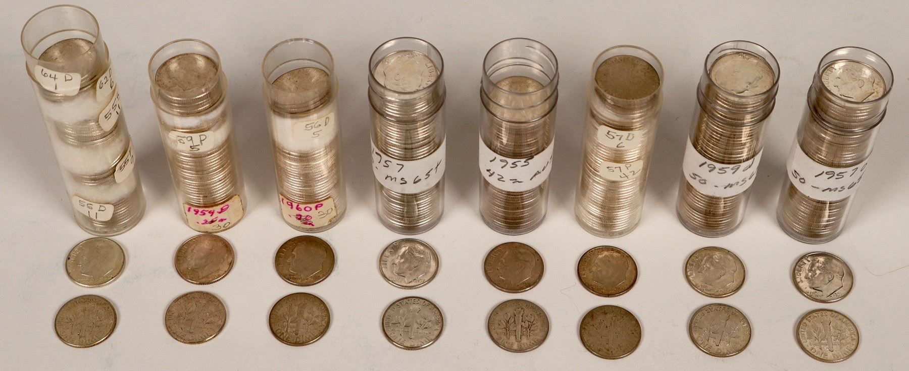 Lot of eight rolls: 1955 (42) AU; 1957 (50) BU; 1957-D (50) BU; 1959-D (50) . Partial rolls: 1957 (42) & 1957-D (6); 1952-D (8),1959 (5), 1959-D (30); 1955-D (11), 1955 (9), 1955-S (11), 1962-D (6), 1964 (1); 1960 (30), 1956-D (5). 356 silve dimes total.