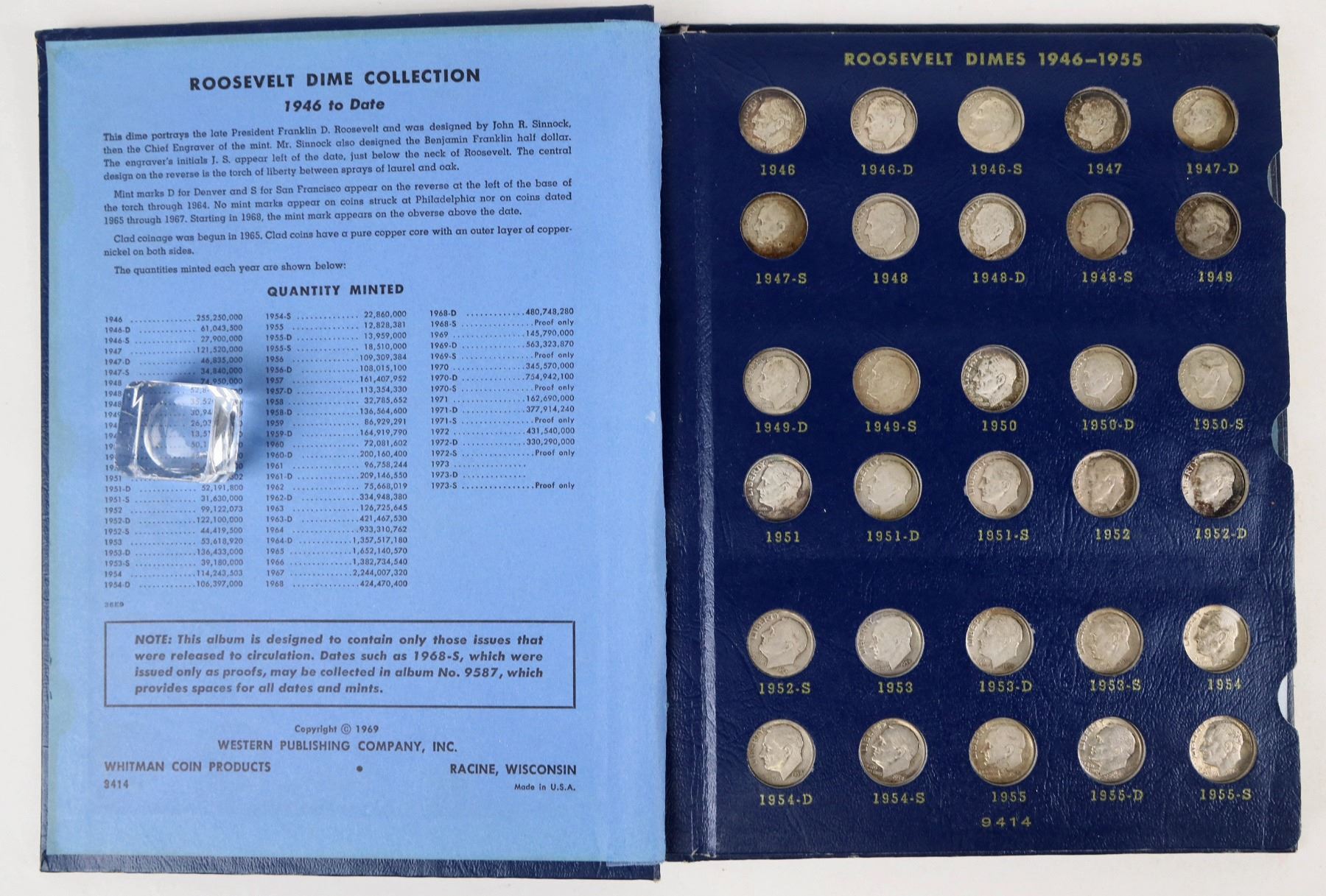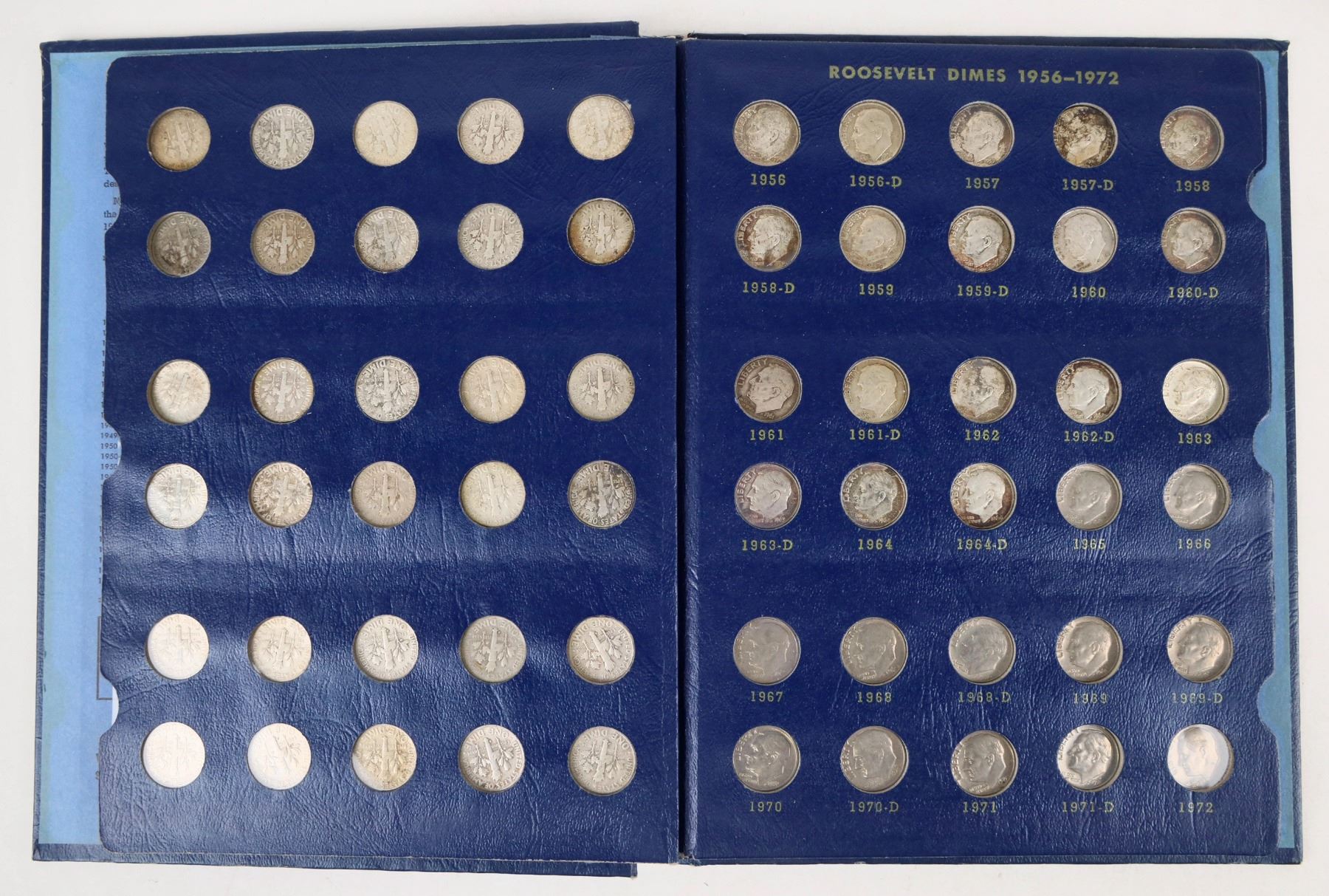 Blue Whitman album #9414 with one hundred Roosevelt dimes: 48 silver; 52 post 1964. Early coins are circulated, VG-EF; 1970s coins are BU.