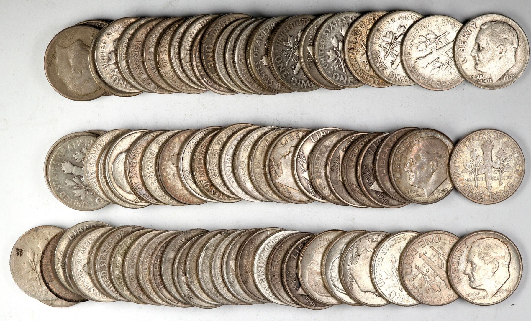 Roosevelt dimes minted 1948-1949: 1948-D: 6 BU; 1948-S: (22: 19 F, 3 EF); 1949: (6: 3 EF, 3 AU); 1949-D: (19: 10 F, 8 EF, 1 BU); 1949-S: (25: 1 G, 18 F-VF, 6 EF). Total 78 silver dimes.