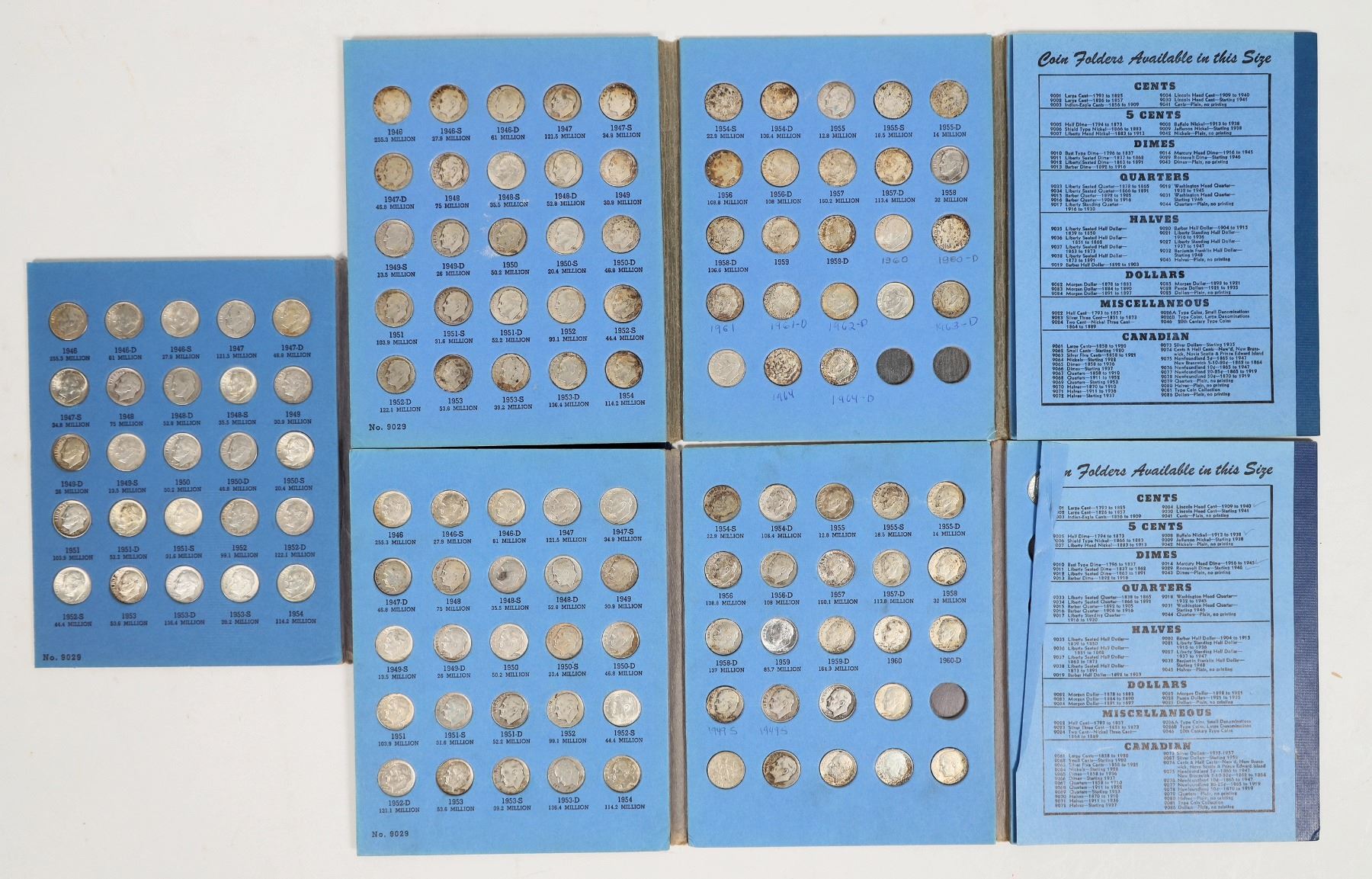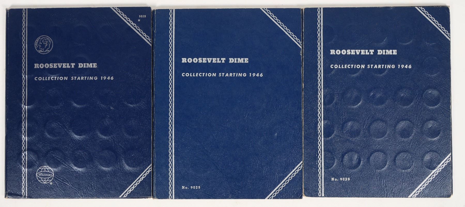 Three blue Whitman coin albums #9029 Roosevelt Dime collection starting 1946: 1) 54 coins, a few BU, all silver. 2) 48 coins, all silver, many toned. 3) 48 coins in silver, one clad 1977. Late 1950s-1964 mostly BU examples.