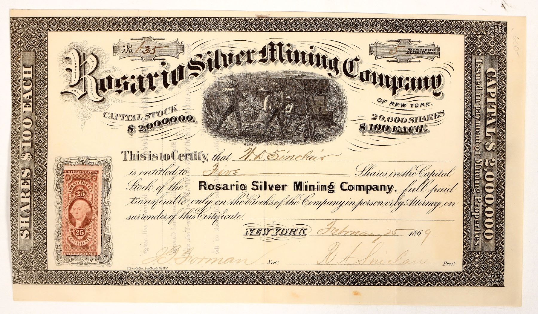 Number 35 for 5 shares to N D Sinclair in 1869. Early date! Signed by RA Sinclair as president. Large 25c revenue stamp. Embossed corporate seal with a crossed pick and shovel. Excellent condition other than a small brown lower spot and trimmed right edge. This company operated a mine 1.5 miles from the famous Solaro mine. The mine was worked in the 1700's by Mexicans. For anyone collecting old Spanish Mines in America this should be one your list!