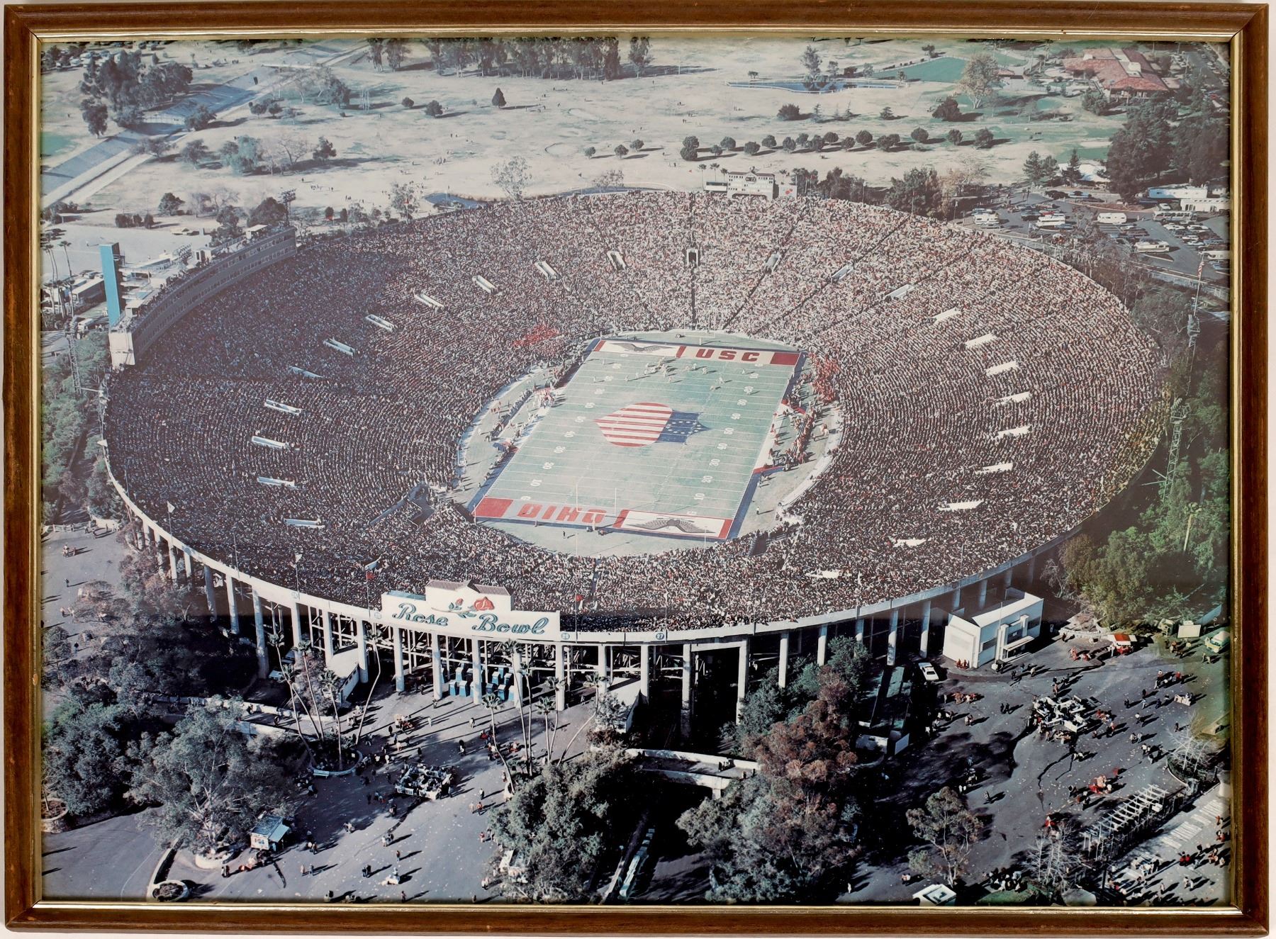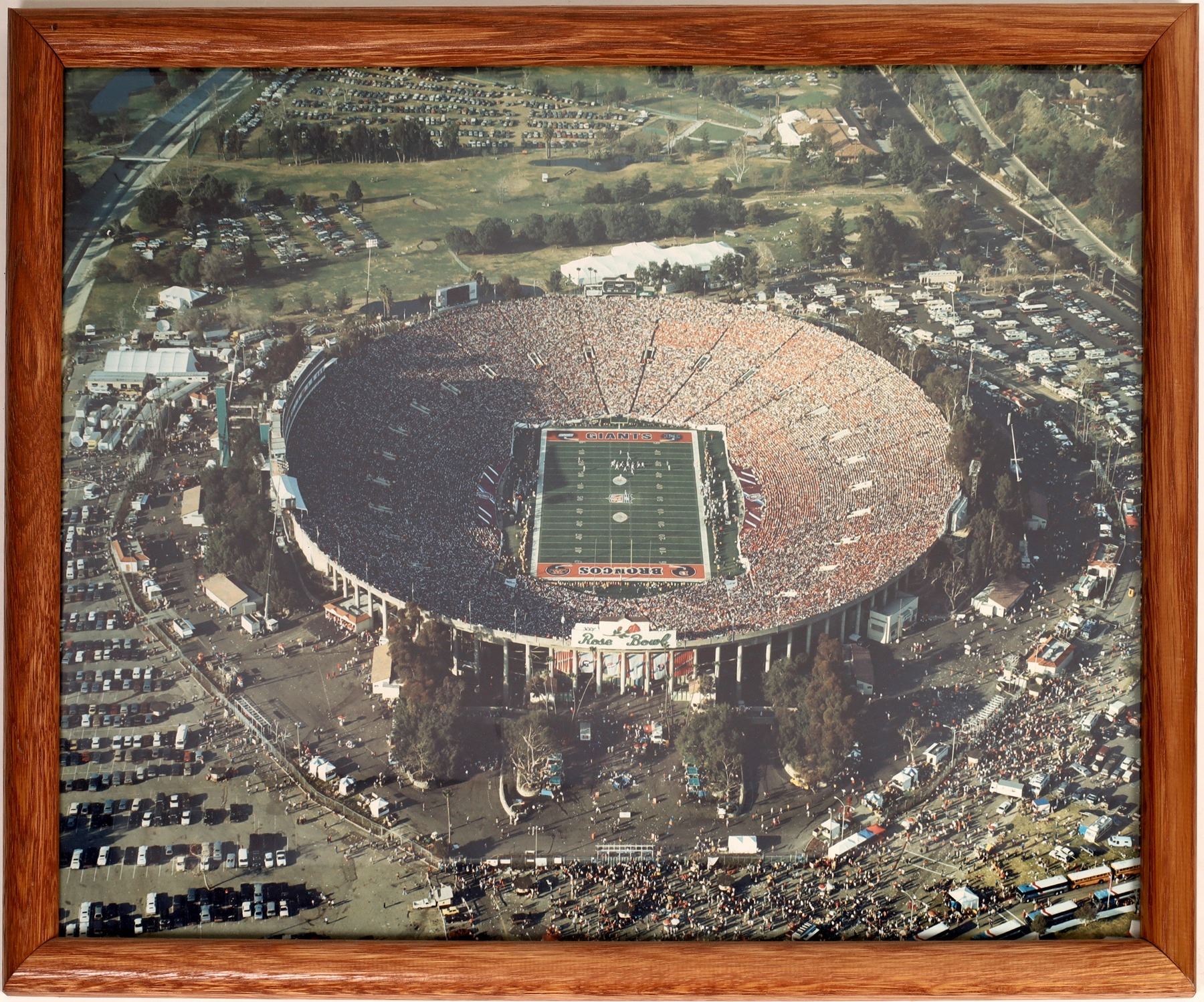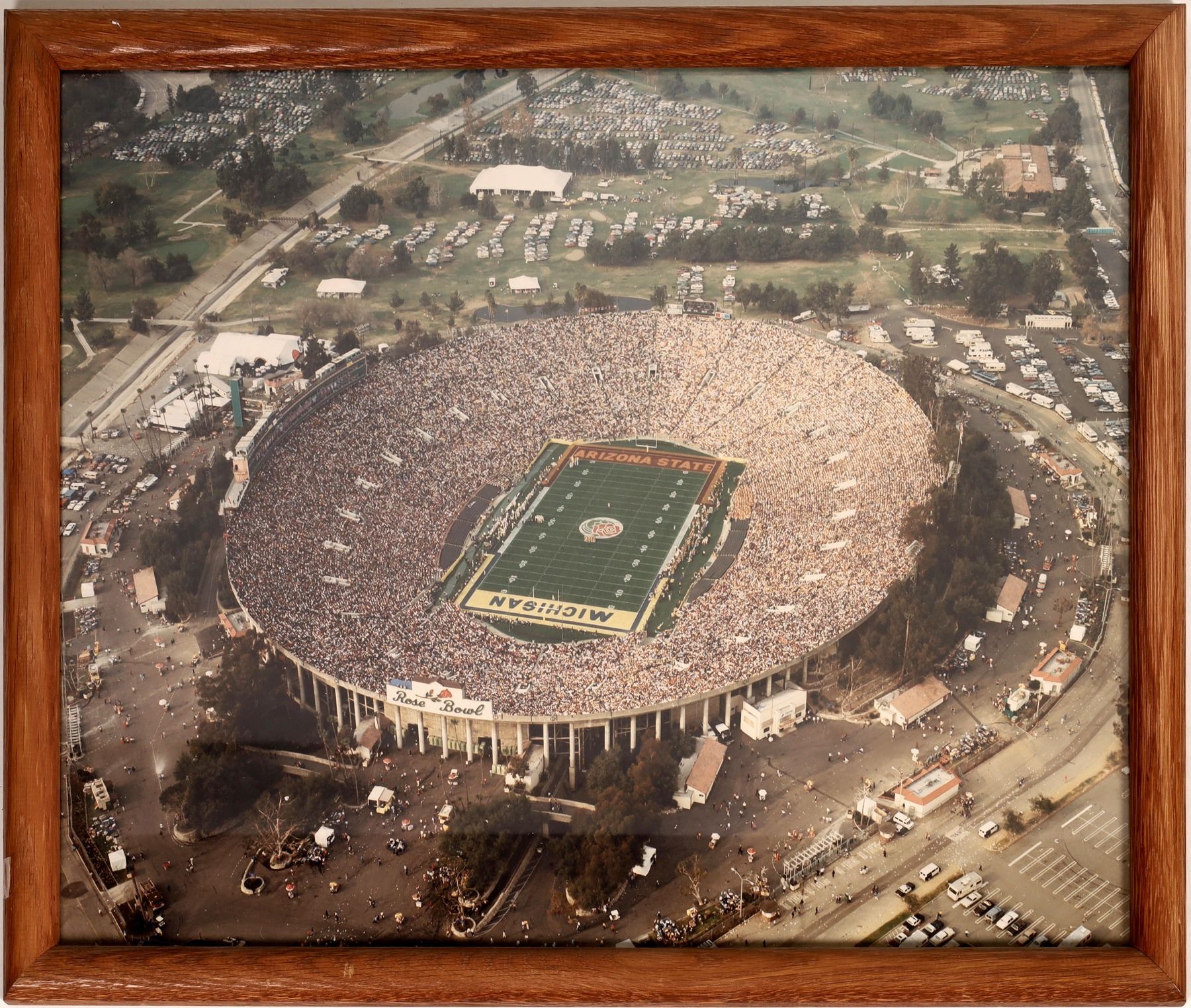 Three framed and glazed aerial photos of the Rose Bowl in Pasadena, California, with the end zones painted for 1987 game between Michigan and Arizona State; the 1997 Super Bowl XXI between the Broncos and Giants; and one of the War of the Roses games between USC and Ohio State held at the Rose Bowl from 1973 to 1975. PLUS a collection of 11 felt sports pennants, all in great condition, most from the Pasadena, California, Tournament of Roses -- the Rose Bowl games: Two 1990 USC Trojans; Three 1990 University of Michigan Wolverines; Two 1991 Iowa Hawkeyes; Three generic Tournament of Roses; One Los Angeles Dodgers. All are close to 12 inches on the spine and about 23-24 inches long. Start your collection with these or add to your existing collection.
