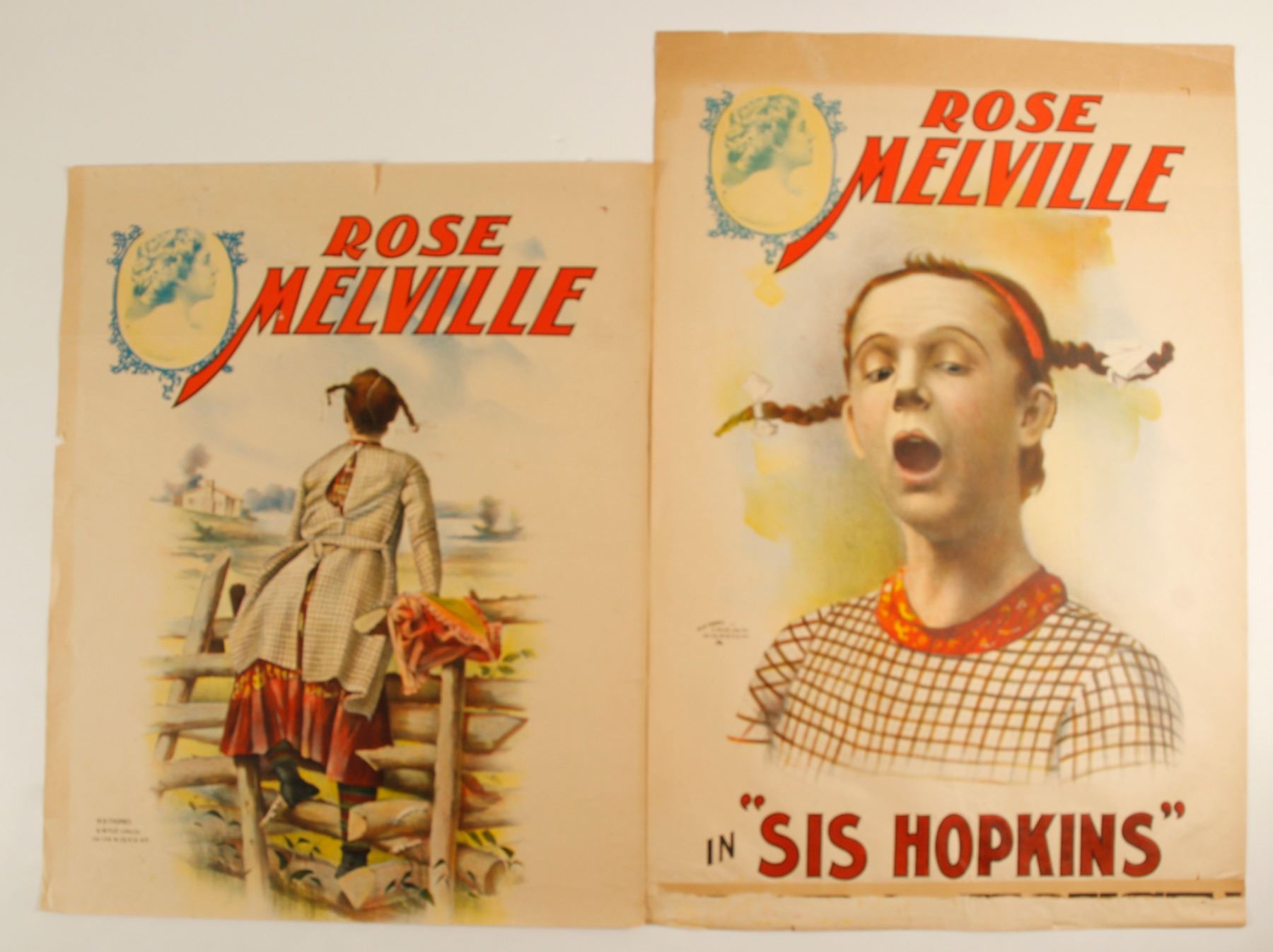 1) Girl looking over the fence 20.5" x 25", done by H.A. Thomas & Wylie Litho Co. NY, 2)Rose Melville in "Sis Hopkins"20" x 30". Rose Melville (January 30, 1867 or 1873 - October 8, 1946) born Rose Smock, was an American stage actress famous for playing one character her whole career, Sis Hopkins. Melville got her start in 1889 at Zanesville, Ohio playing a male role in a play called Queen's Evidence. Other known plays she appeared in were Uncle Tom's Cabin, The Two Orphans and Fanchon the Cricket. (Wikipedia) The "Sis Hopkins" litho has slight tearing in upper-right (1.5" tear in margin) please inspect. The litho with girl looking over fence has 1" tear at top. Provenance James Mackie.