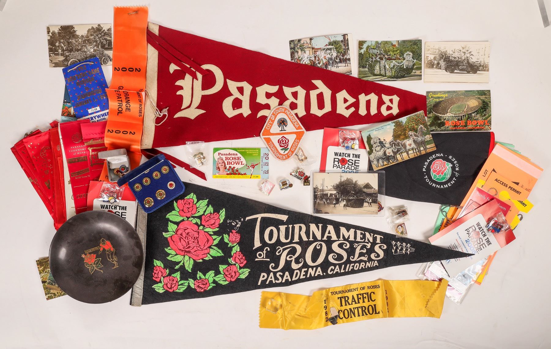 Rose Parade assortment. Patches, felt pennants, hat, collector pins, book, photos, postcards etc. From the collection of a parade volunteer. South Pasadena California