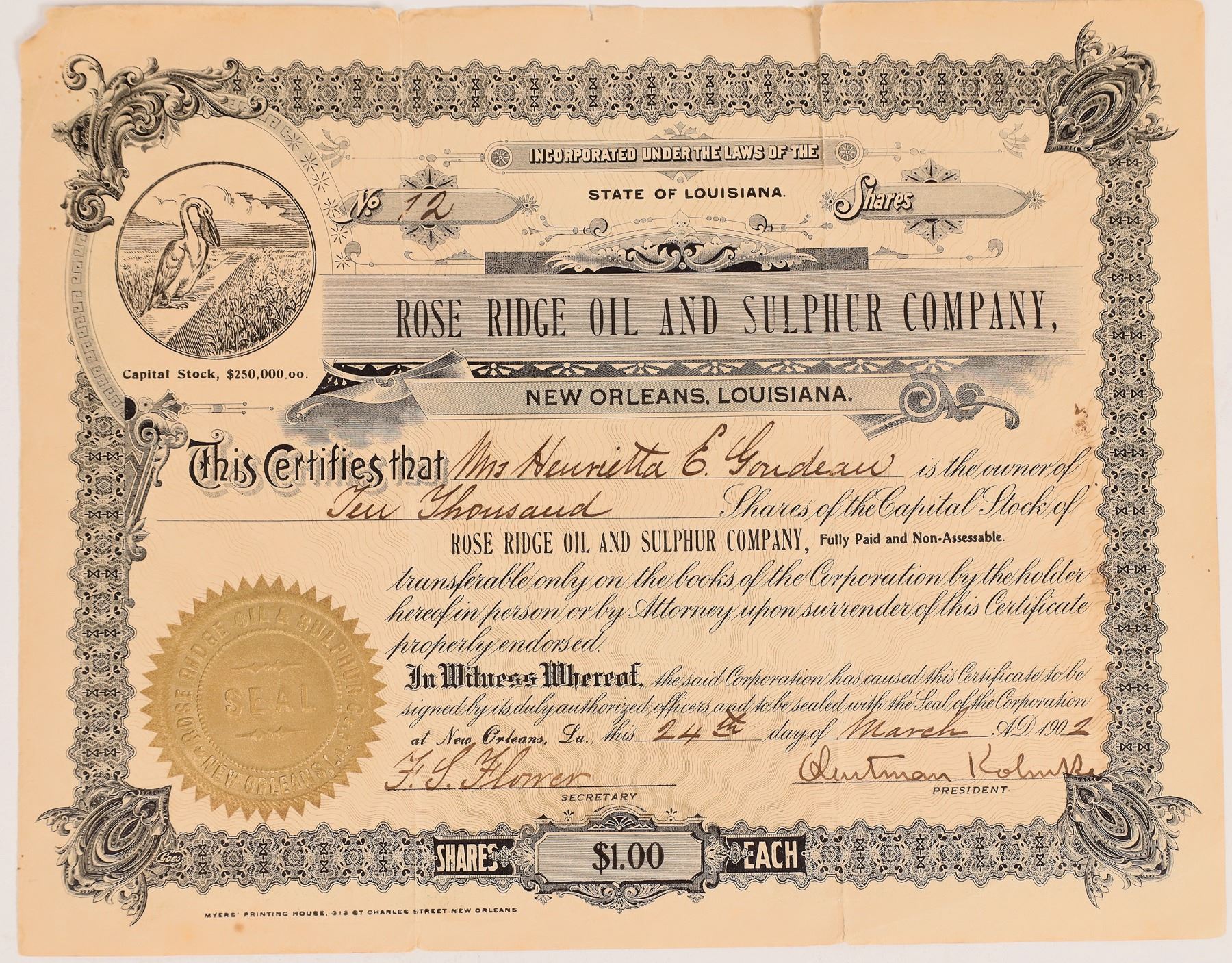 Rose Ridge Oil and Sulfur Co stock issued 1902 to Henrietta E Gourdeau, 10000 shares. Pelican vignette on left. Corner chip, 5 vertical tears-largest 1.5", pin hole. Please inspect.
