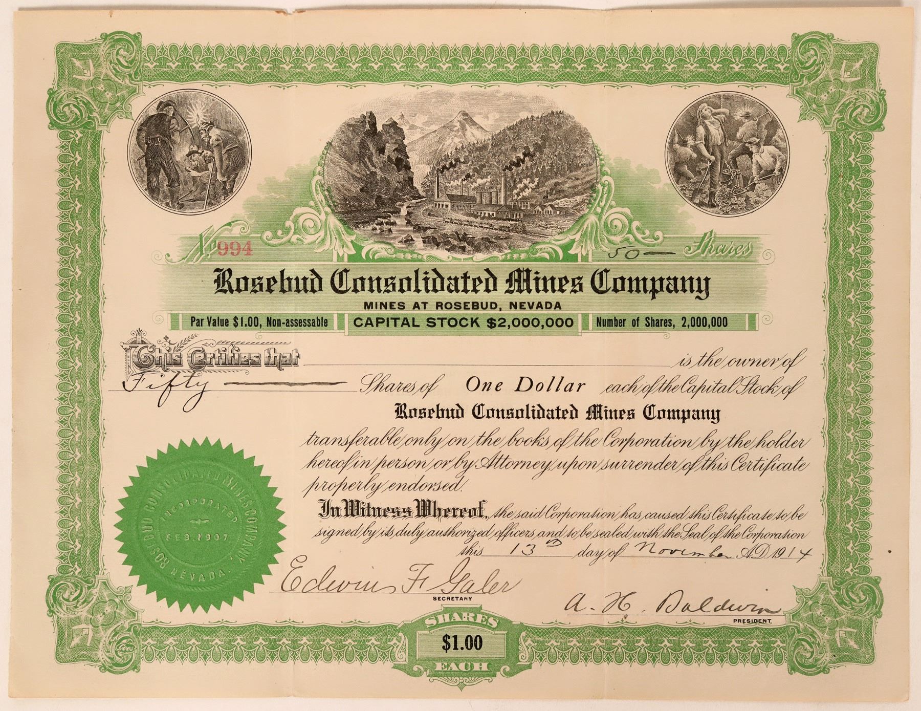 Rosebud Cons. Mines Company Stock issued for 50 shares in 1914. Mines at Rosebud, Nevada printed on the masthead. Three mining vignettes. Rosebud, Nevada is located in Pershing County, 45 miles north-northwest of Lovelock. Silver was discovered at Rosebud in 1906. With the boom, the town swelled to 5,000 residents. But by 1908, the town wilted (Paher, Nevada Ghost Towns and Mining Camps). Apparantly, our company was giving it another try. Paher notes about Rosebud, "except for a few buildings of later construction, not a bloomin' thing is left." In very good condition. Two fold lines. Uncancelled.