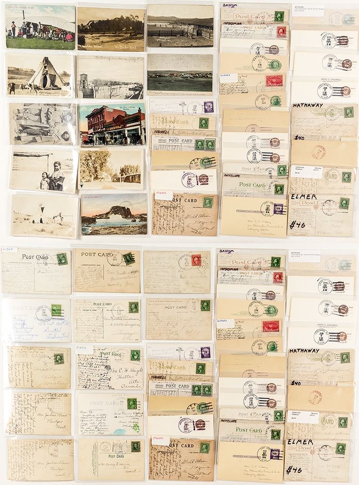 35 total postcards. Four postmarks, 4 picture postcards, and 9 RPC's. Nice Bascom RPC of a pastoral stream, 4 Native American RPC's. Also RPC's of Birney and Forsyth, Montana in the snow. Postmarks include Lame Deer, Ingomar, Hathaway, Birney, Bascom, Lee, Finch, Brandenberg, Elmer, Ivanell (1915-1926), Howard, Colstrip, Ashland, Birney, Angela, Ashaland, Cartersville. Several are postal cards. (Svoboda Collection) City: Rosebud County State: Montana Date: c1911-1971 HWAC# 35561