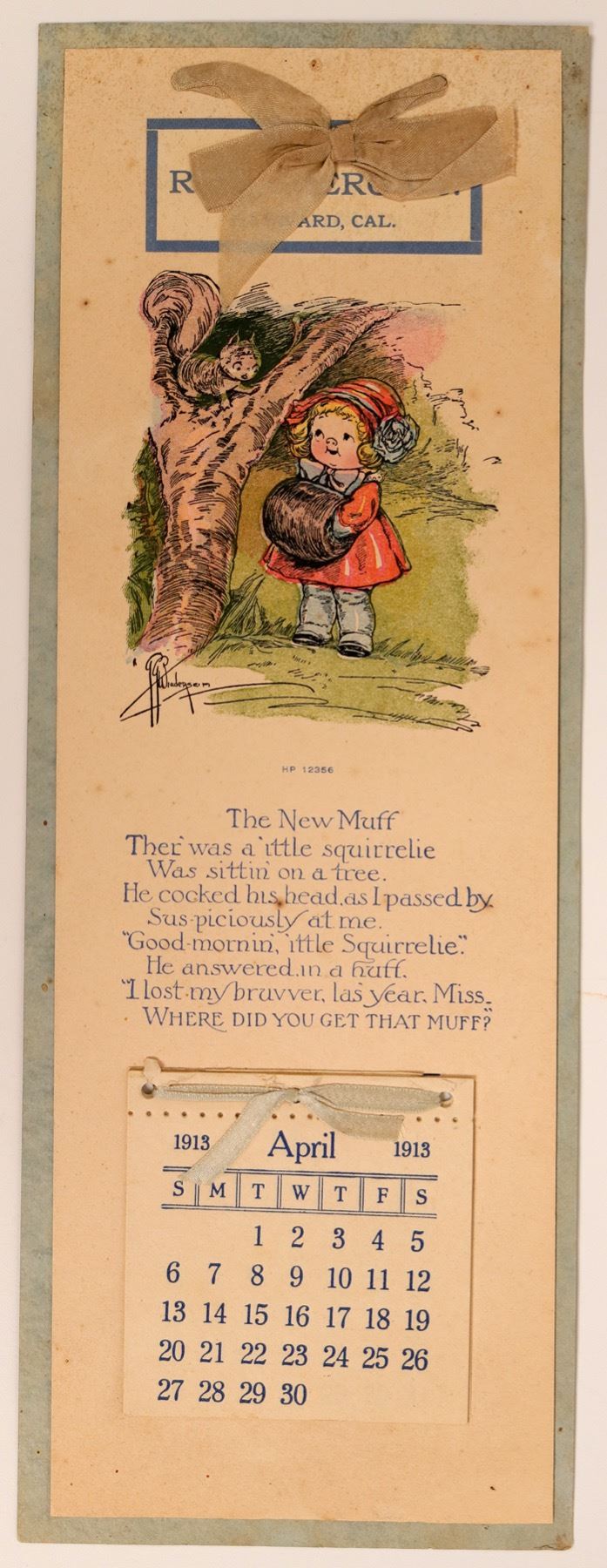 Classic piece of Americana. A turn of the century Miss Muffet Calendar missing the first 3 months of the year of 1913. The New Muff Poem featured on calendar. Printed and distributed as advertising for the Rosenburg Co. Mint Condition.