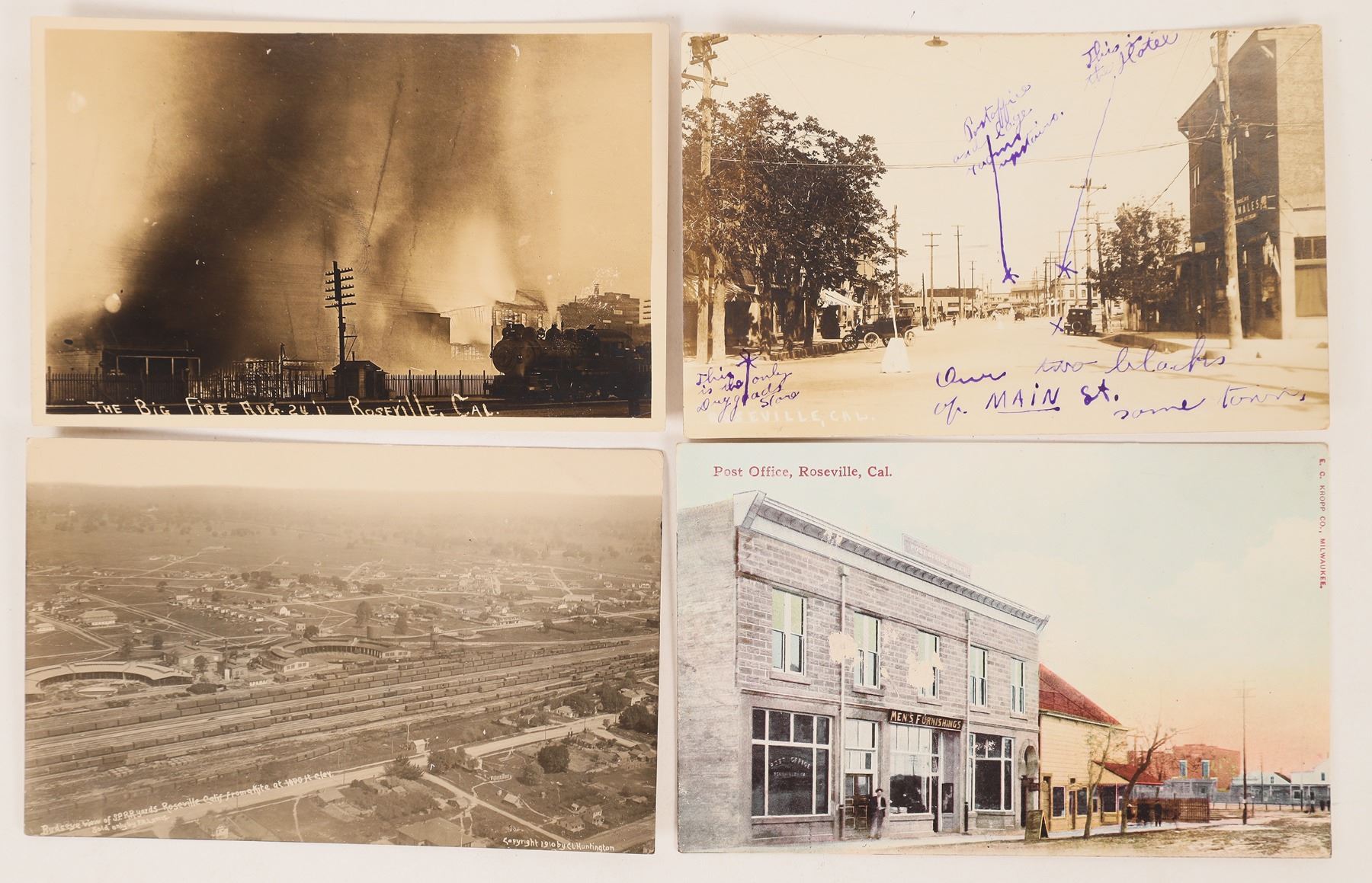 Lot of 4. Three RPC's. one w/wht.border. Birdseye View : 1910 era RR yards from 1000 ft kite. . Street level view:A Fire of Roseville fully involved, Main st. 1912 era, Post office California Roseville 1910 era Ken Prag Collection