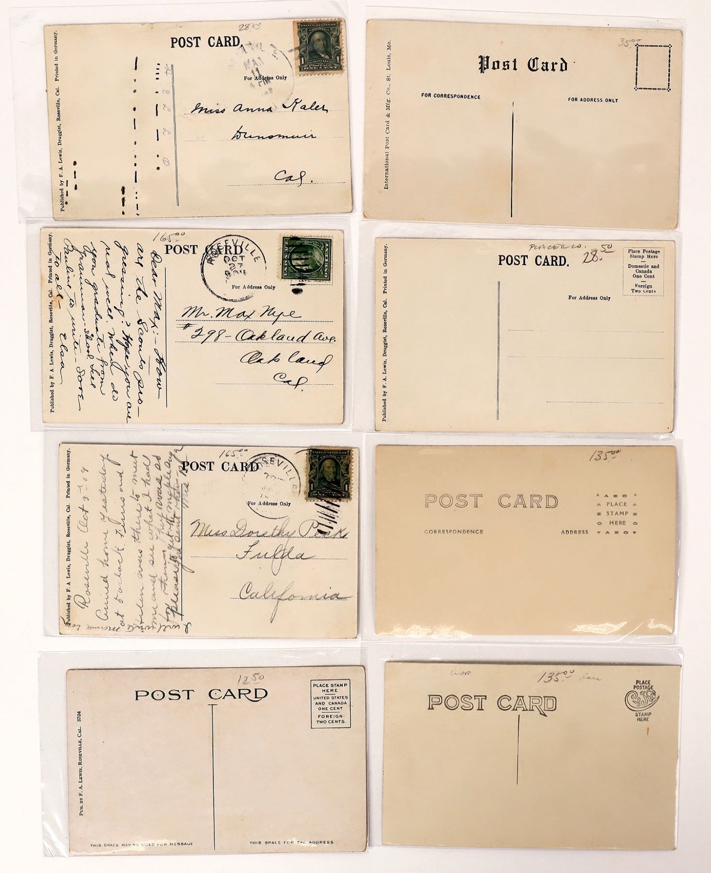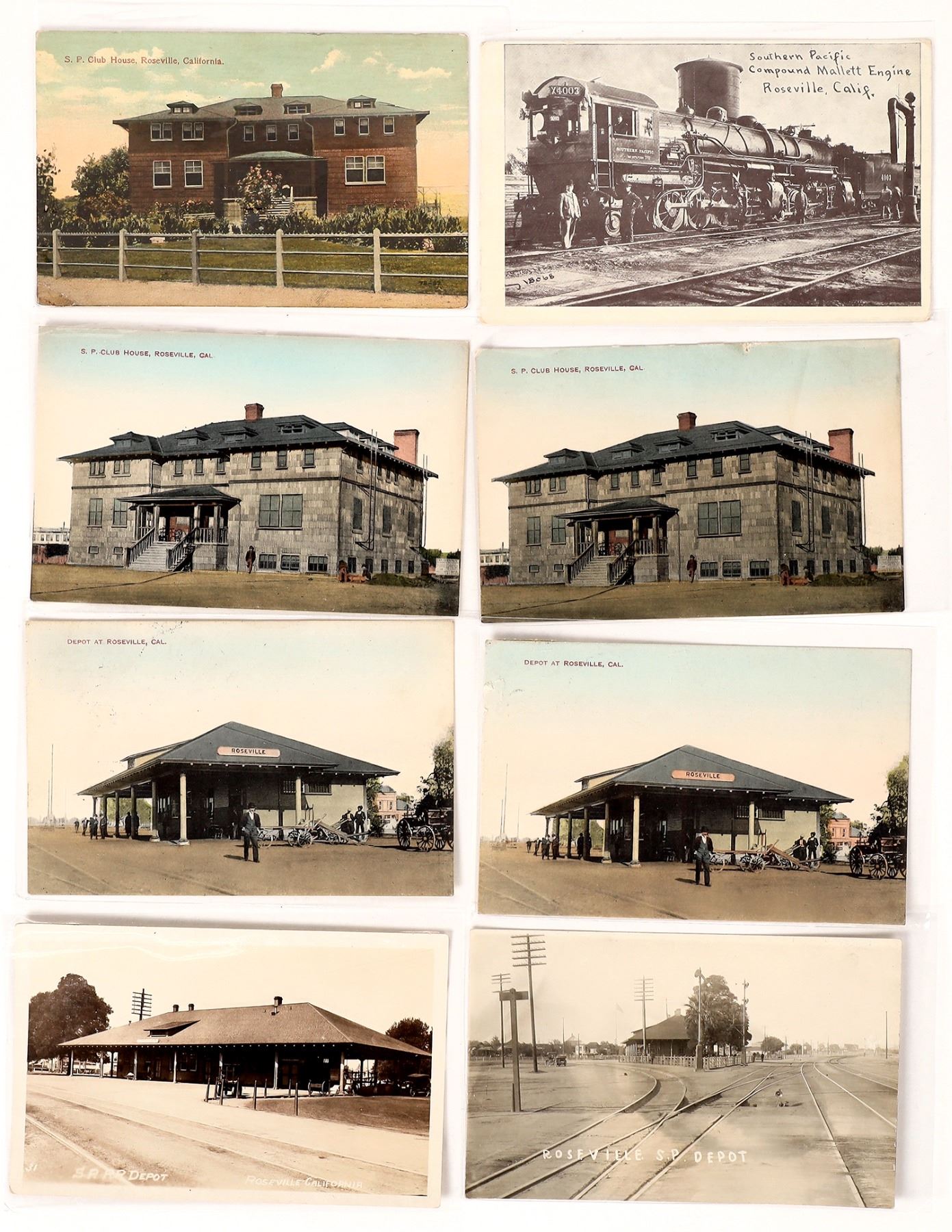 Lot of 8. Two RpC's of the S.P.R.R. depot in Roseville. Two color cards of the depot. Three color cards of the S.P. Club House. One wht. border divided back of the S.P. #X4003 compound Mallet Steam Engine or the cab forward 2-8-8-2 , compound steam engines were considered more efficient than one boiler engines. California Roseville 1910 era Ken Prag Collection