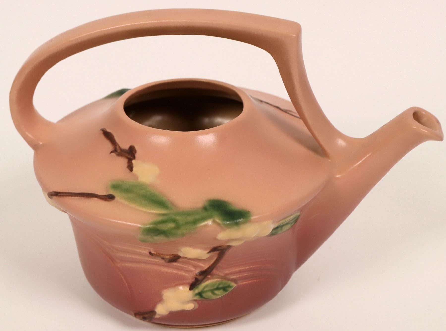 This is a Roseville Pottery teapot that measures 8"x 10". Although there appears to be no damage or chips, the lid is missing. See photos for more details.