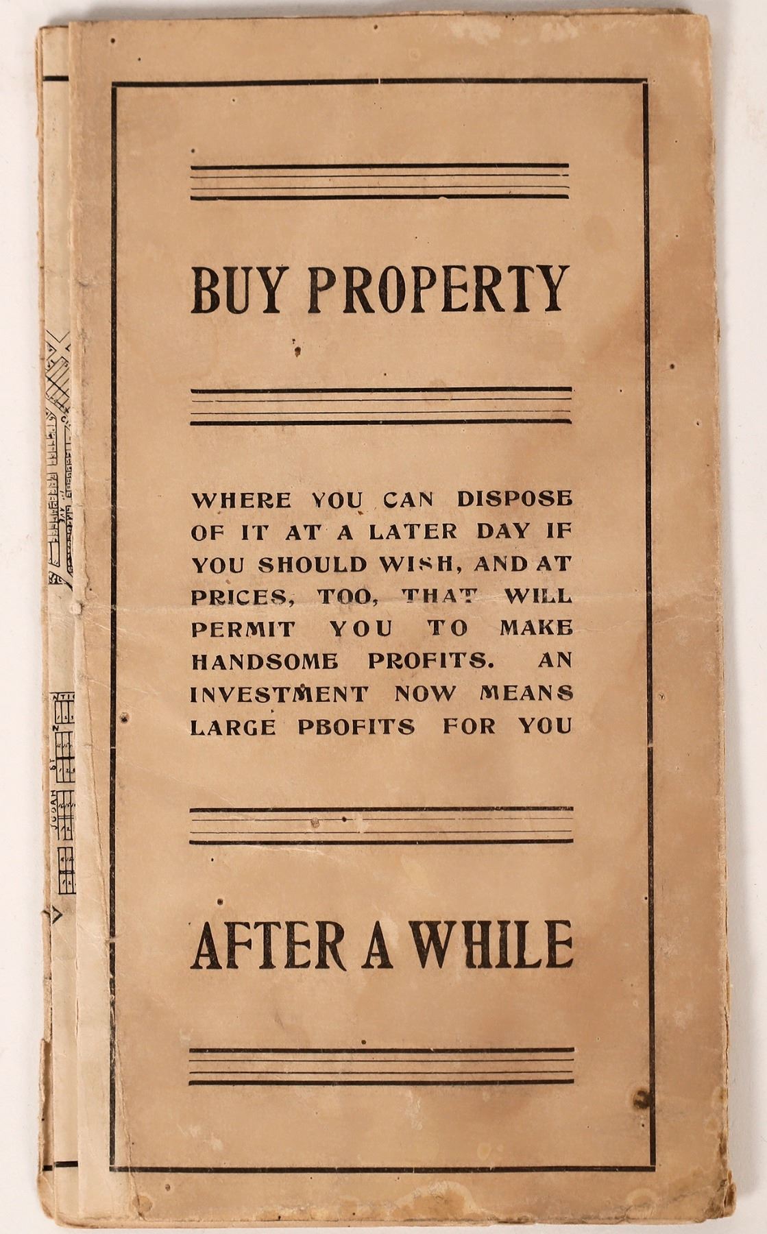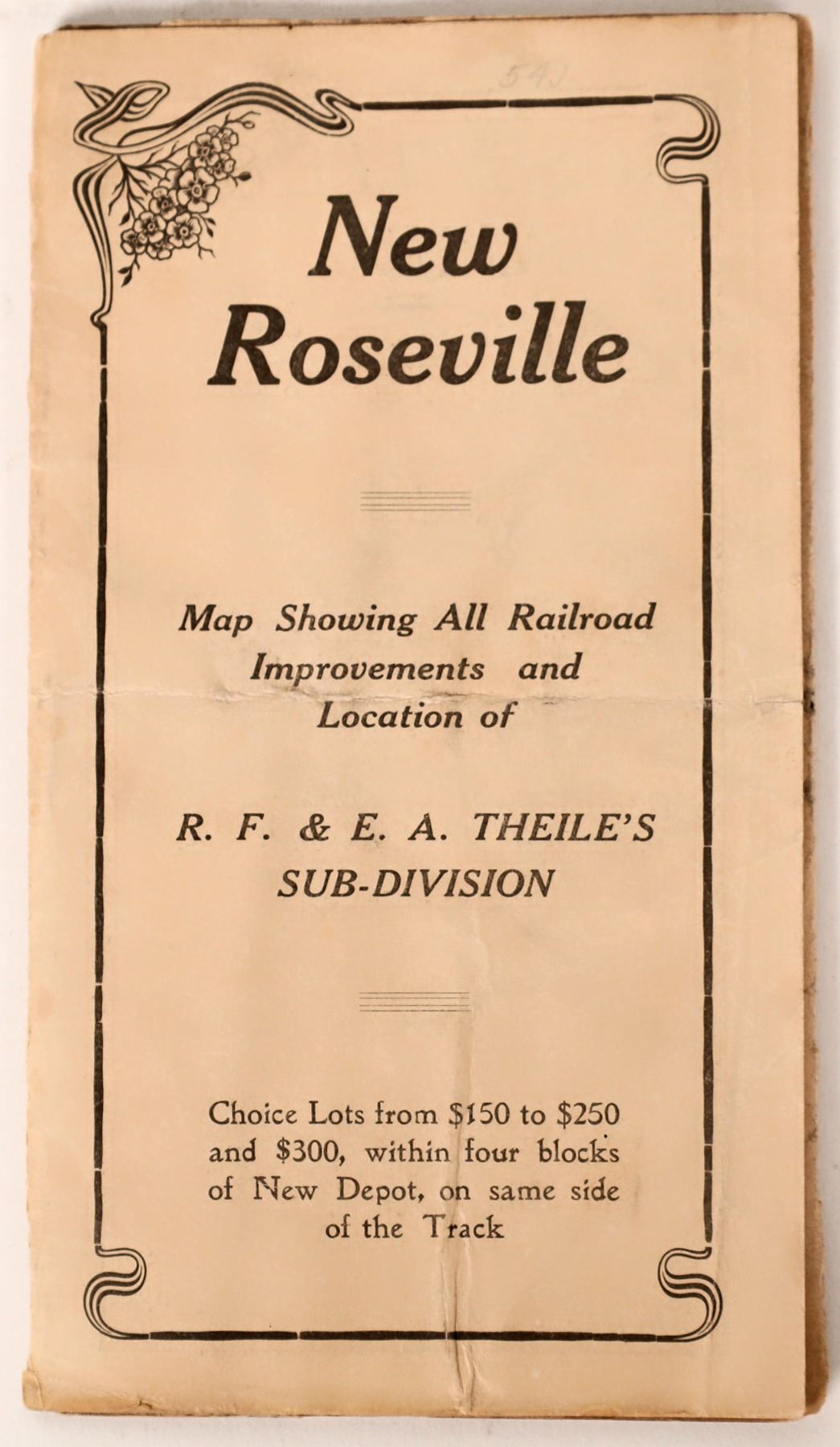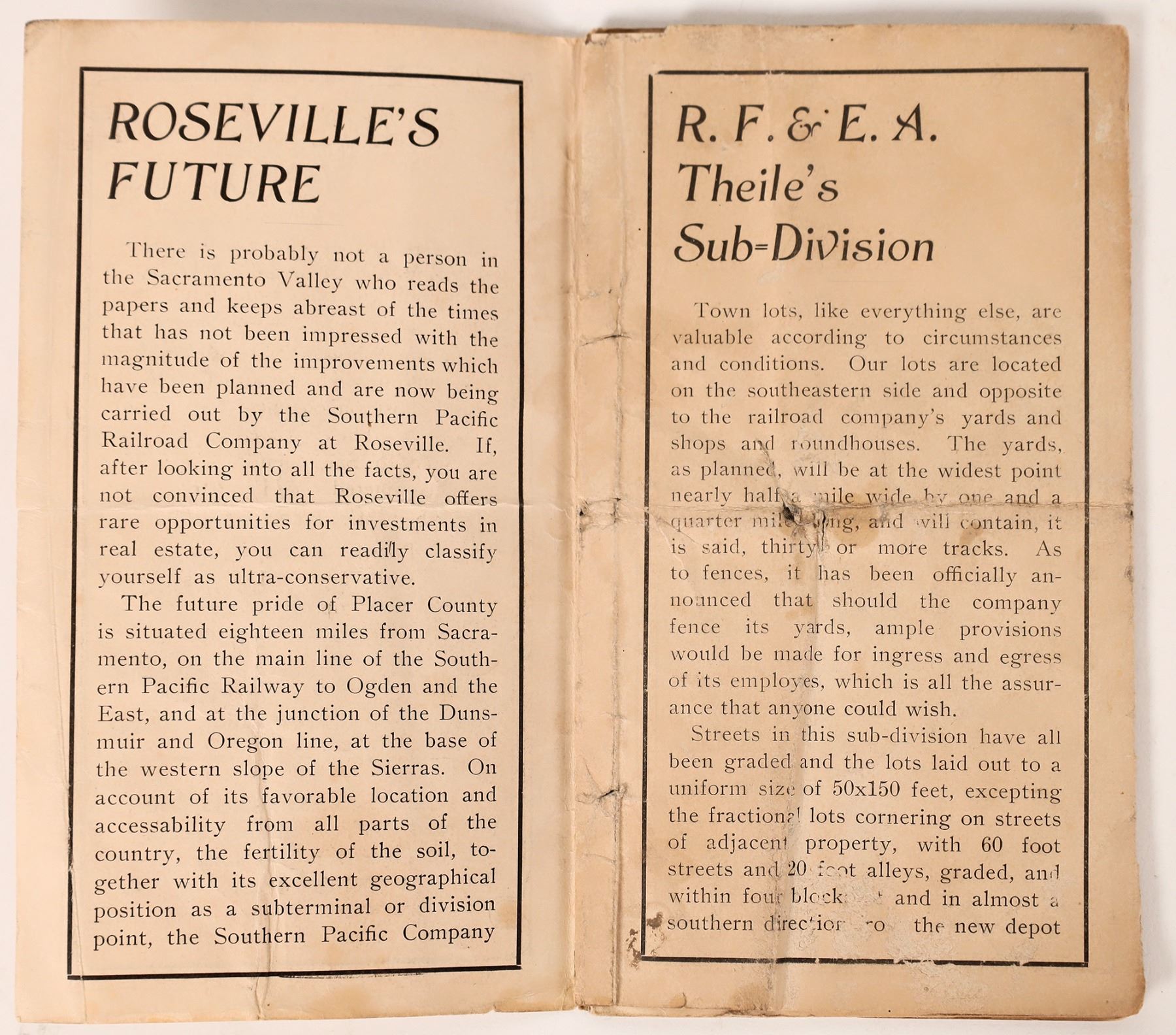 Undated 14pp folded promo booklet for New Roseville with panorama drawing on verso, railroads etc. 2" tear on center vertical crease. California Roseville