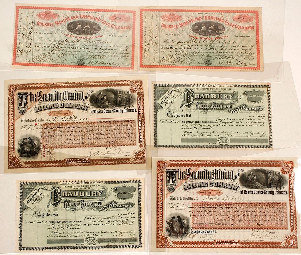 "Rosita is a former silver mining town thatfs currently home to a quiet rural community. Its name is Spanish for glittle roseh, named for the wild roses that grew there. Rosita went from a quiet ranching community in the 1870s to a silver boom town of 1500 by 1878. There were numerous profitable mines around town, including Pocahontas and Humboldt. It became the county seat, a position it took from Ula (now a ghost town) in 1878 and held until 1886, when Silver Cliff won it. In its heyday it had several hotels, a saloon, weekly newspaper, cheese factory and even one of the best breweries in state.The silver mines declined in town in the 1880s, slowly migrating people away." from uncovercolorado.com. Summit Mining and Milling 31920 issued to RC Flower 1887 400 shares and #4079 issued to Charles Davis Jr 1888 100 shares. Radbury Gold and Silver Mining, 2 u/i. Buckeye Mining and Tunneling Co. of Colorado-#6020 i/u 1880 and #6730 i/u to Joseph Cristadoro 1880 100 shares (Al Adams Gold Rush Memorabilia Collection) Date: Location: Rosita Area, Colorado HWAC# 58746