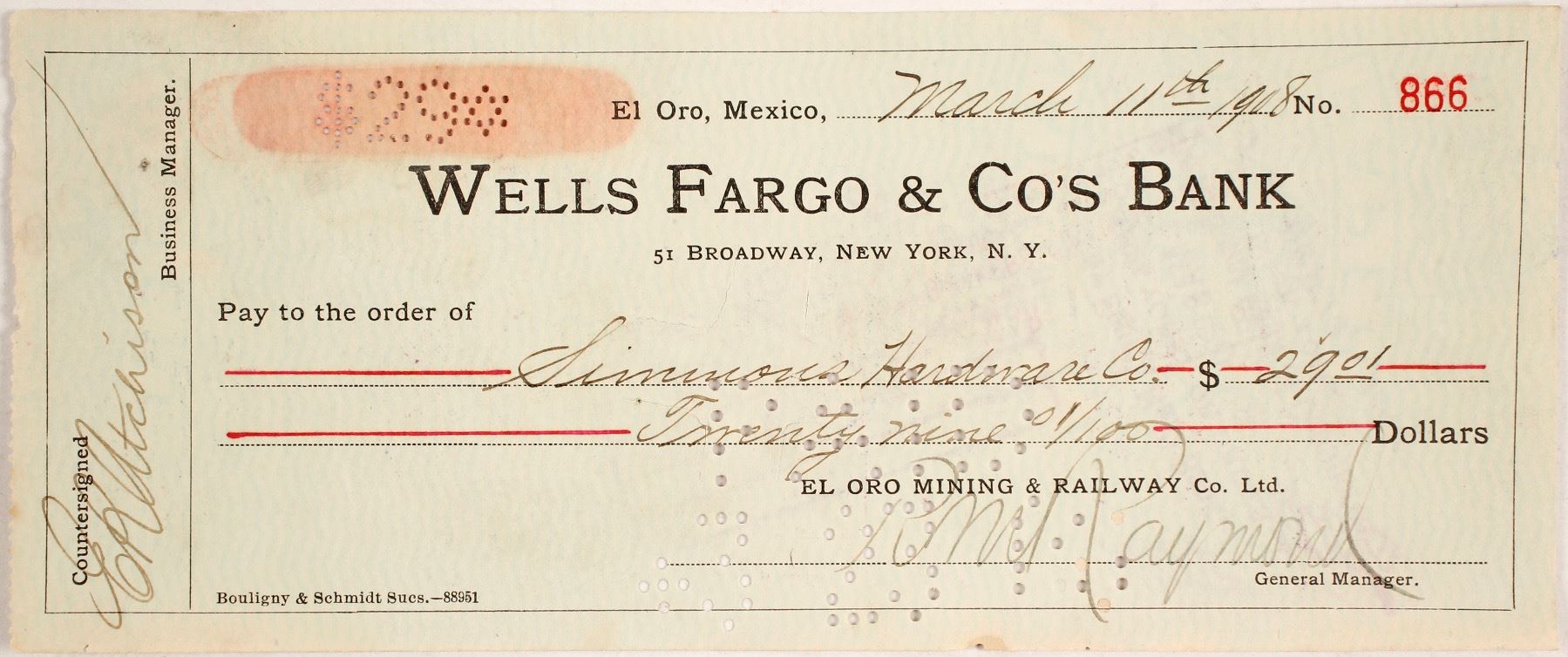 Wells Fargo & Co. Bank (Manhattan) check, datelined El Oro, Mexico, signed by mining magnate Rossiter Raymond March 11, 1918. Raymond (1840-1918) was the general manager at the time of the El Oro Mining & Railway Co. The El Oro gold mine was known to indigenous peoples as early as 538AD. Spanish records there go back to 1529. A city was formed there in 1787. Production rose to a peak after US and foreign investments in the 1890's and onward, until a slowdown in 1926. Rossiter Raymond got his mining engineering degree at Freiburg. He worked as the US Mineral Commissioner afer J. Ross Browne, 1869-1875, but left under the same circumstances as Browne- the US Government did not pay him his last year. Understanding the need for advanced information on mining to help investors and educate the public, Rayomnd was named as the first head of the new American Institute of Mining Engineers where he edited the Engineering and Mining Journal, a major organization mostly composed of people from the production side of the mining business, now in a new form known as SME. We have not had one of Raymond's autographs before. Date: City: State: New York HWAC# 78472