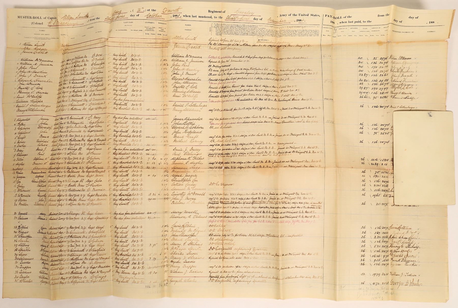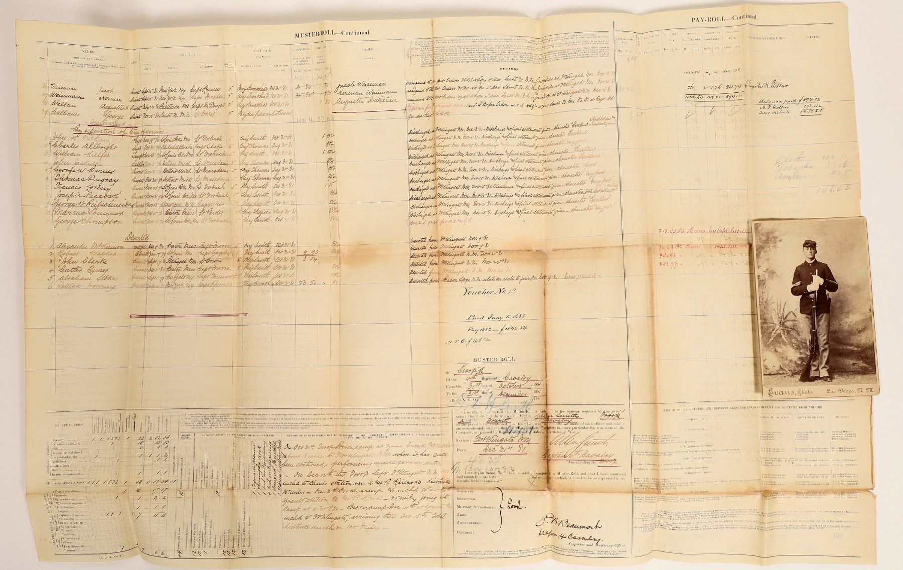 This is the Muster and Payroll listing for soldiers, enlisted and officers at Fort Wingate in the New Mexico Territory. It also shows the various journeys taken by this Indian War era regiment, noting distances and time periods to complete those journeys. it's a very carefully written account showing that back in the day, a fully equipped army could cover 100 miles across the Arizona desert in a mere 15 days. Also included with this historic document is a 4.5"x 6.5" photo of an enlisted man, marked Evans, Photo, Las Vegas, N.M.