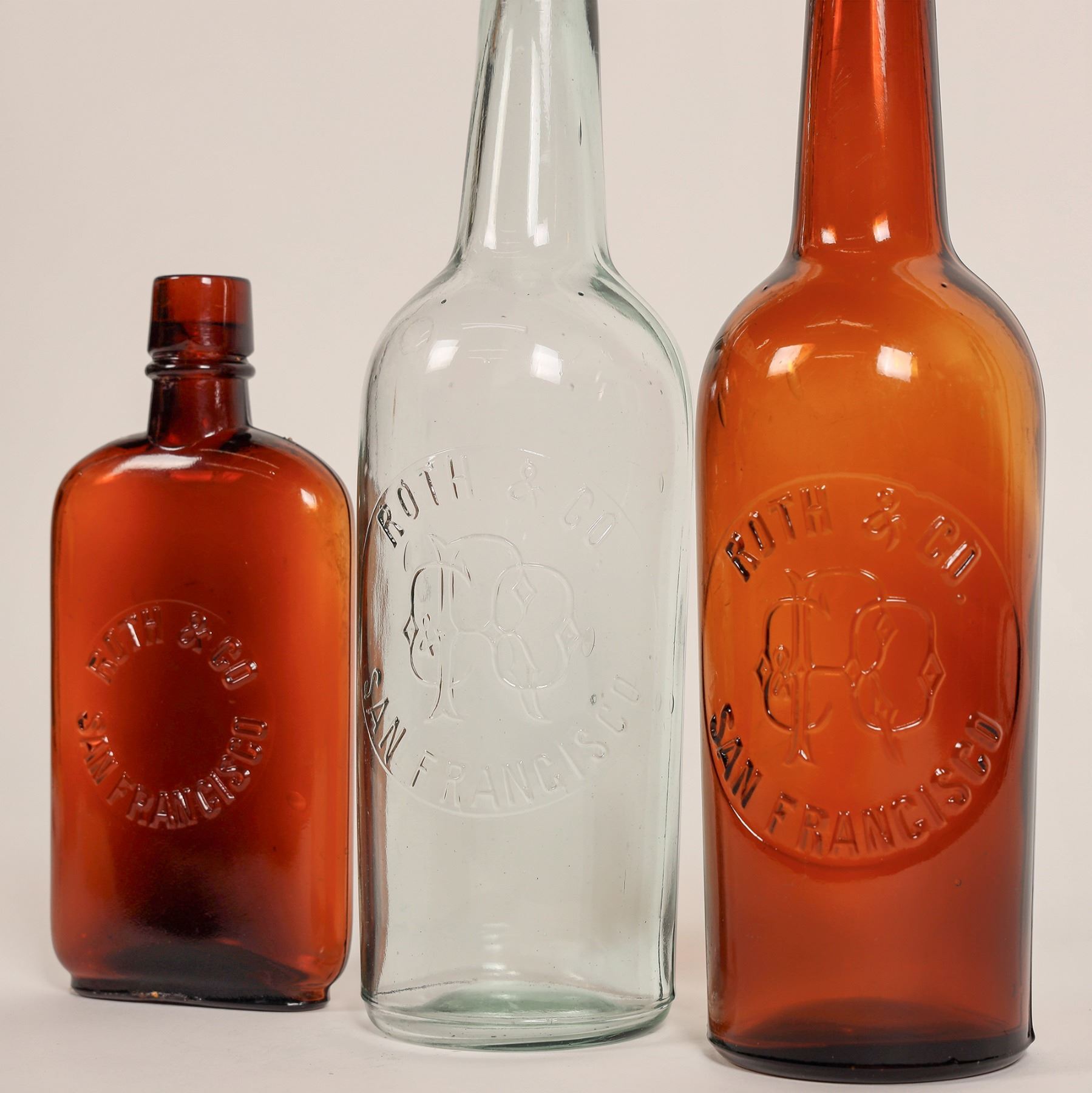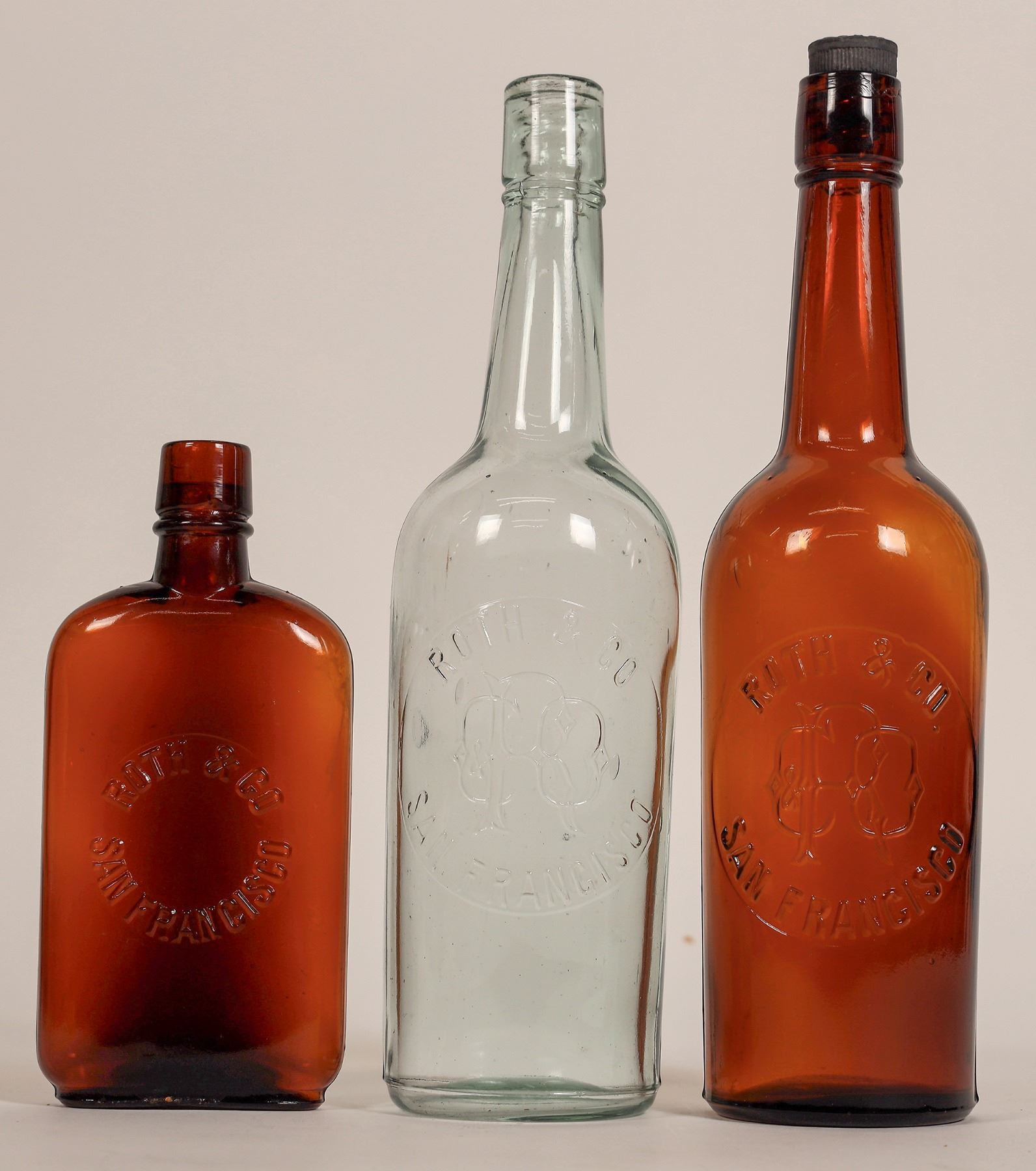3 different Roth whiskeys c 1900-1910. A.) Rare aqua inside screw fifth B.) amber inside screw fifth c.) Amber pink flask. All sparkling clean. [San Francisco] [California]