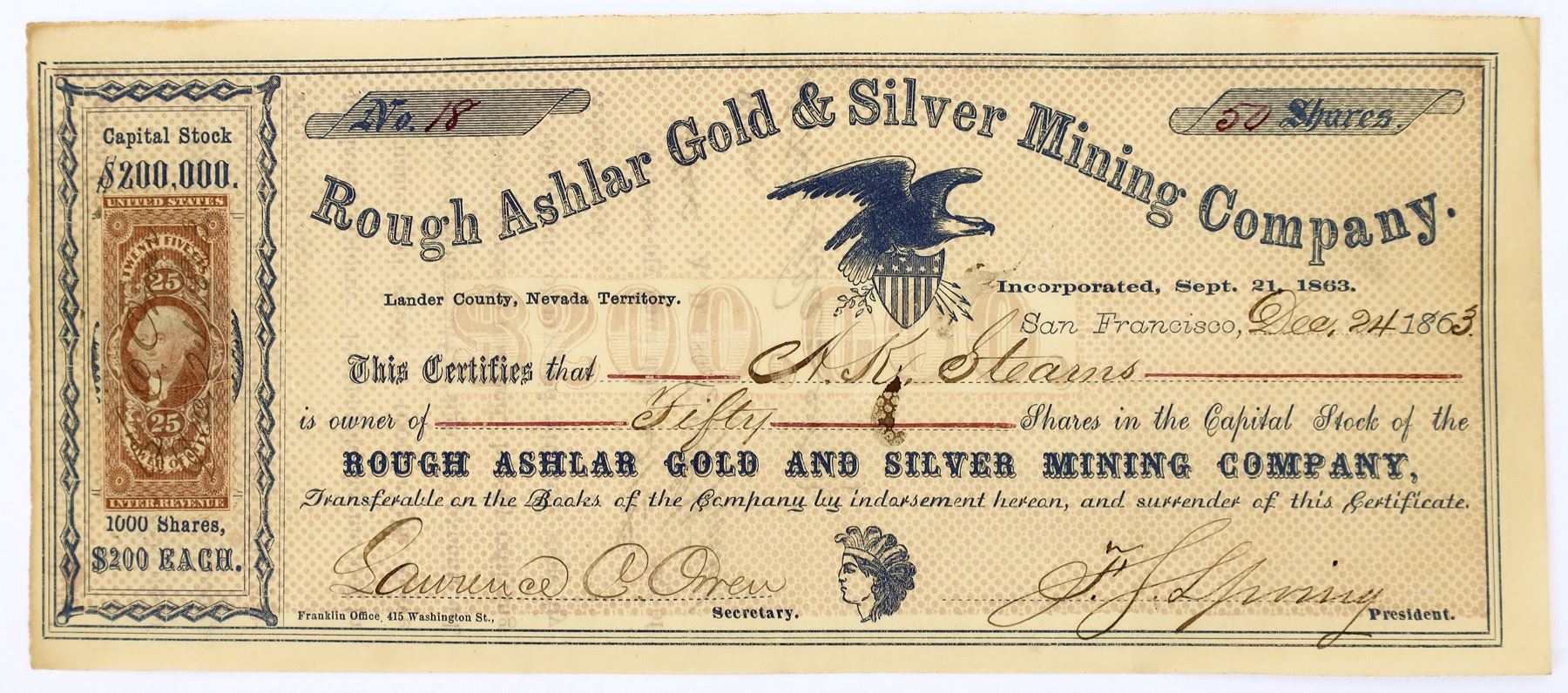# 18 for 50 shares to A. K. Stearns. Signed by Lawrence C Owen and president FL Spring. Dateline San Francisco 1863. Incorporated September 21, 1863. Stearns must have been a big believer in the Reese River District. We know of at least five other Reese River stocks he had purchased: Butte, Delta, St. Mary's, Julia Hunter and Stearns. He was superintendent of the Stearns Gold & Silver mine. Owen was a professional mining secretary in San Francisco. 25c Power of Att'y revenue stamp. Not cancelled. Location: Reese River District, Lander County. Underprint $200,000. Reddish brown safety paper. Eagle and American shield vignette. RARA! Franklin Office, printer. As described in the explanation of the First Degree Tracing Board, in Emulation and other Masonic rituals the rough ashlar is a stone as taken directly from the quarry, and allegorically represents the Freemason prior to his initiation; a smooth ashlar (or "perfect ashlar") is a stone that has been smoothed and dressed by the experienced stonemason, and allegorically represents the Freemason who, through education and diligence, has learned the lessons of Freemasonry and who lives an upstanding life. [Wikipedia]