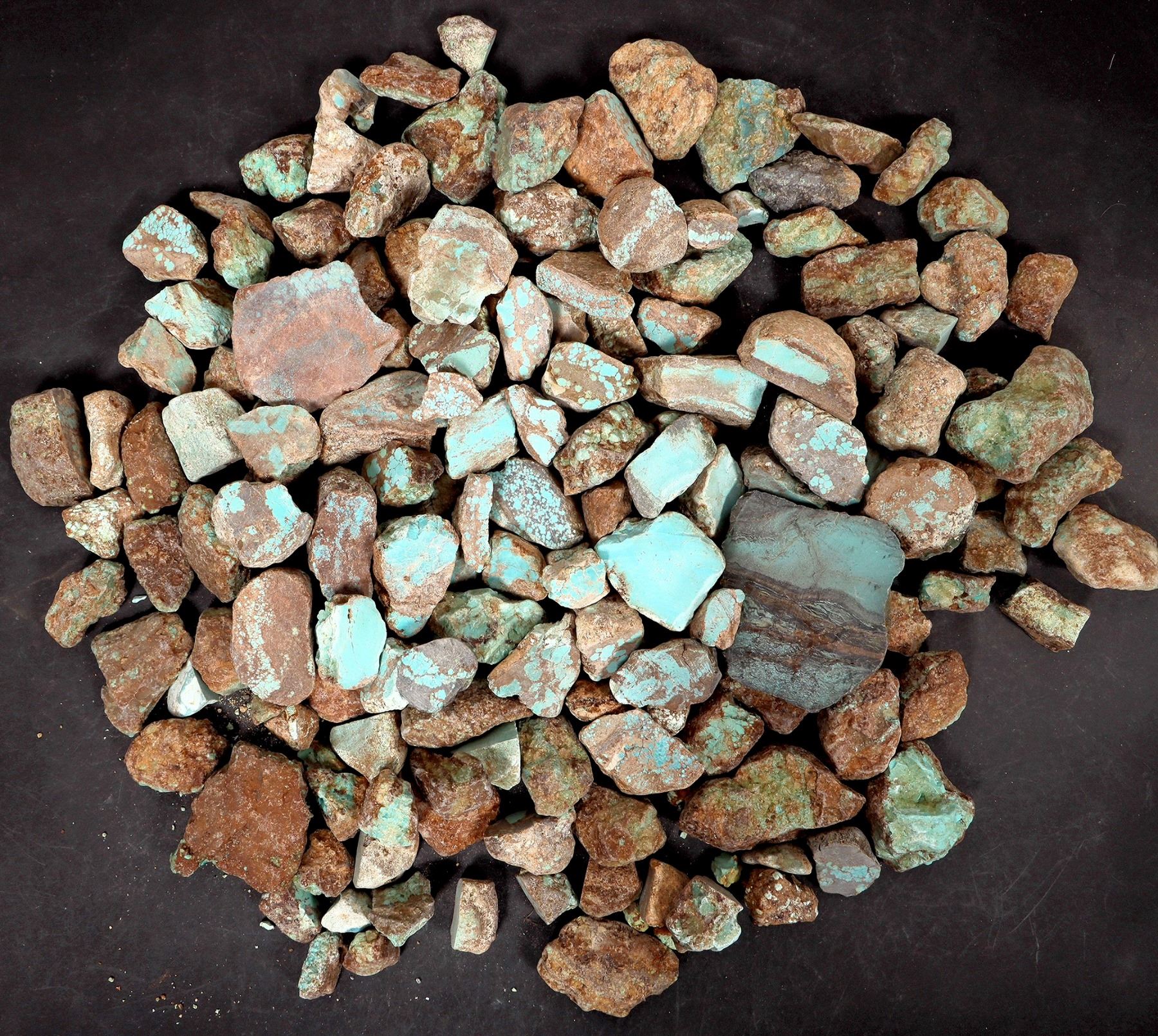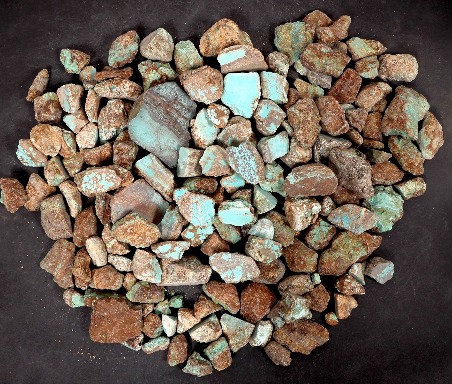 Rough turquoise - mix of cut and uncut pieces, untreated. Mix of oxidized and unoxidized pieces, both greens and blues. Approximate weight 13.0 pounds. Pieces range from around 1" to 4" in length. There's a lot of variation in size/color throughout this lot; see photos for more detail. This turquoise originates from the No. 8 turquoise mine of Cortez, Nevada, often considered one of the top turquoise mines in the world. It was previously in storage for 35 years.