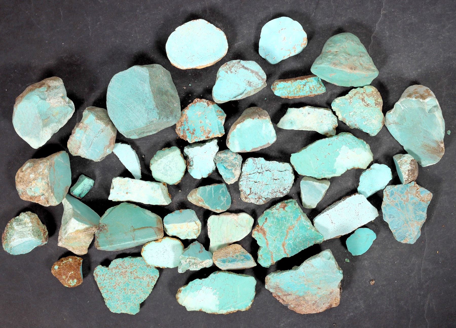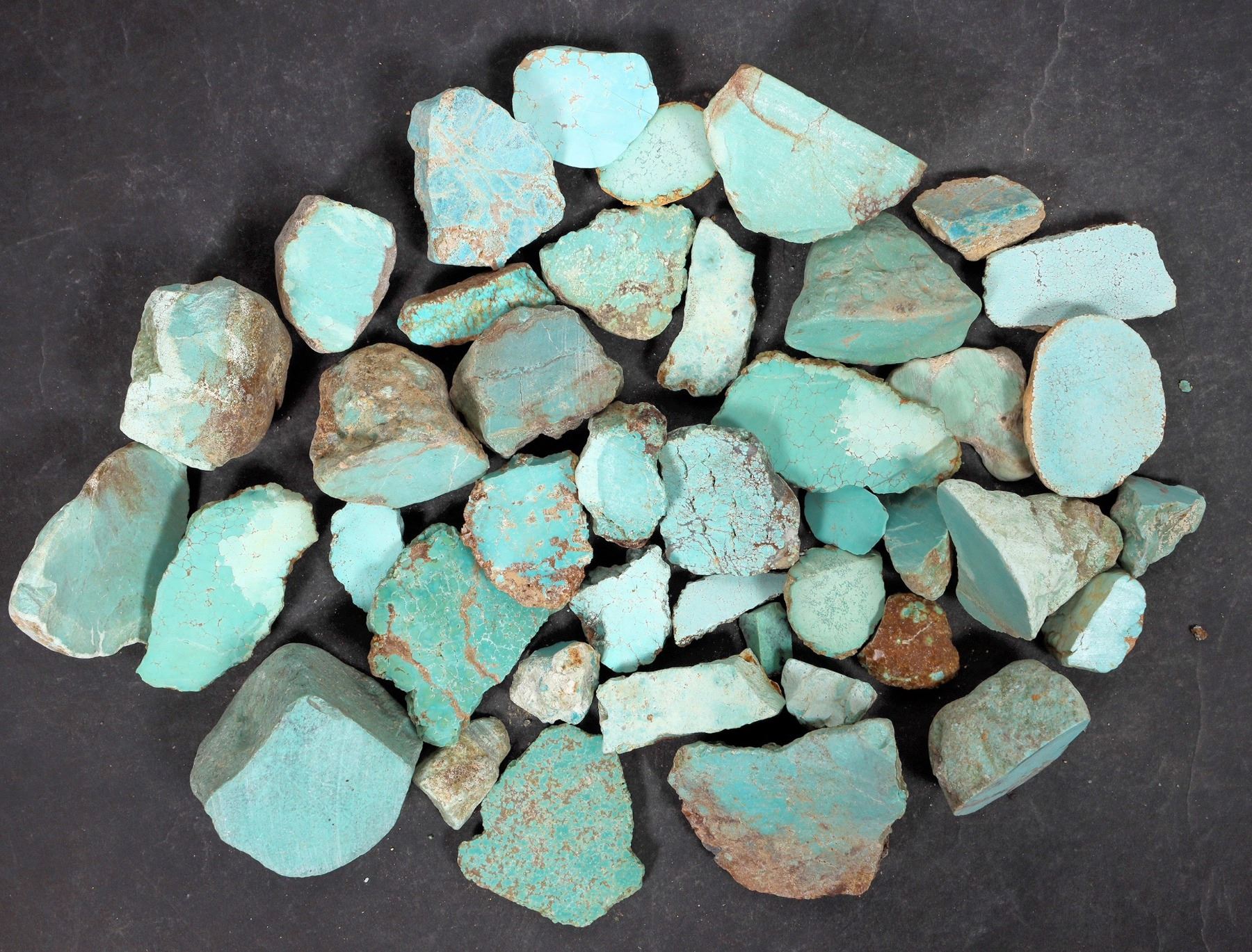 Rough turquoise - small-medium cut pieces with flat faces, some treated, some untreated. All light blue, some with a greenish cast. Approximate weight 2.8 pounds. Pieces range from around .75" to 2" in length. This turquoise originates from the No. 8 turquoise mine of Cortez, Nevada, often considered one of the top turquoise mines in the world. It was previously in storage for 35 years.