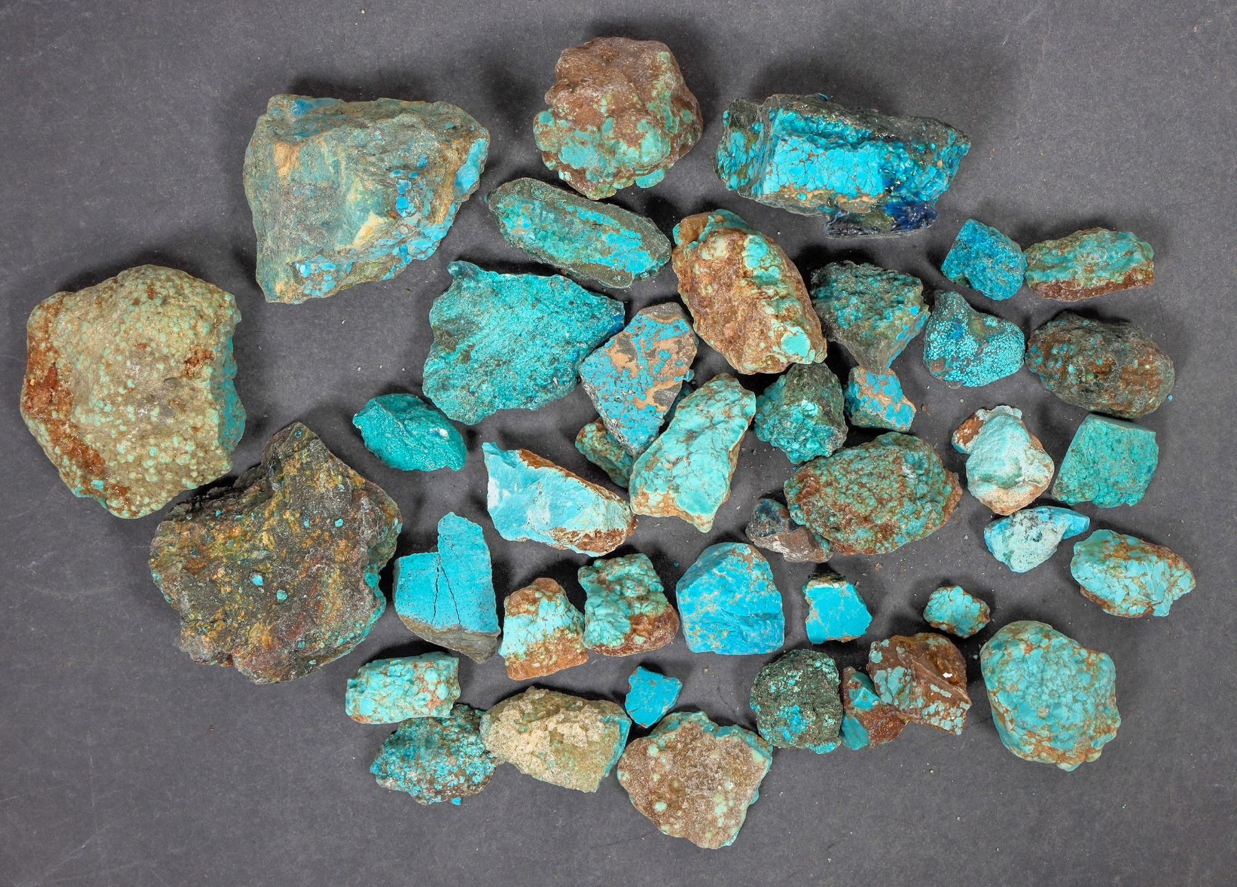 Rough turquoise - small-medium pieces, all treated and mostly dyed, deep blue in color. Approximate weight 2.6 pounds. Pieces in the lot range from around 1" to 3.25" in length. This turquoise originates from the No. 8 turquoise mine of Cortez, Nevada, often considered one of the top turquoise mines in the world. It was previously in storage for 35 years.