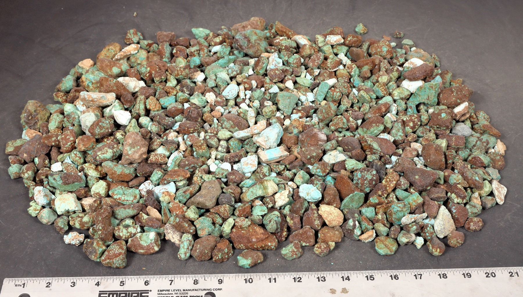 Rough turquoise - small-medium uncut pieces, mostly treated. Most pieces are a medium green color, though a few light blue pieces are included. Approximate weight 15.0 pounds. It was previously in storage for 35 years. Pieces in the lot range from around .5" to 2" in length. Beautiful color in this lot -- see photos. This turquoise originates from the No. 8 turquoise mine of Cortez, Nevada, often considered one of the top turquoise mines in the world. It was previously in storage for 35 years.