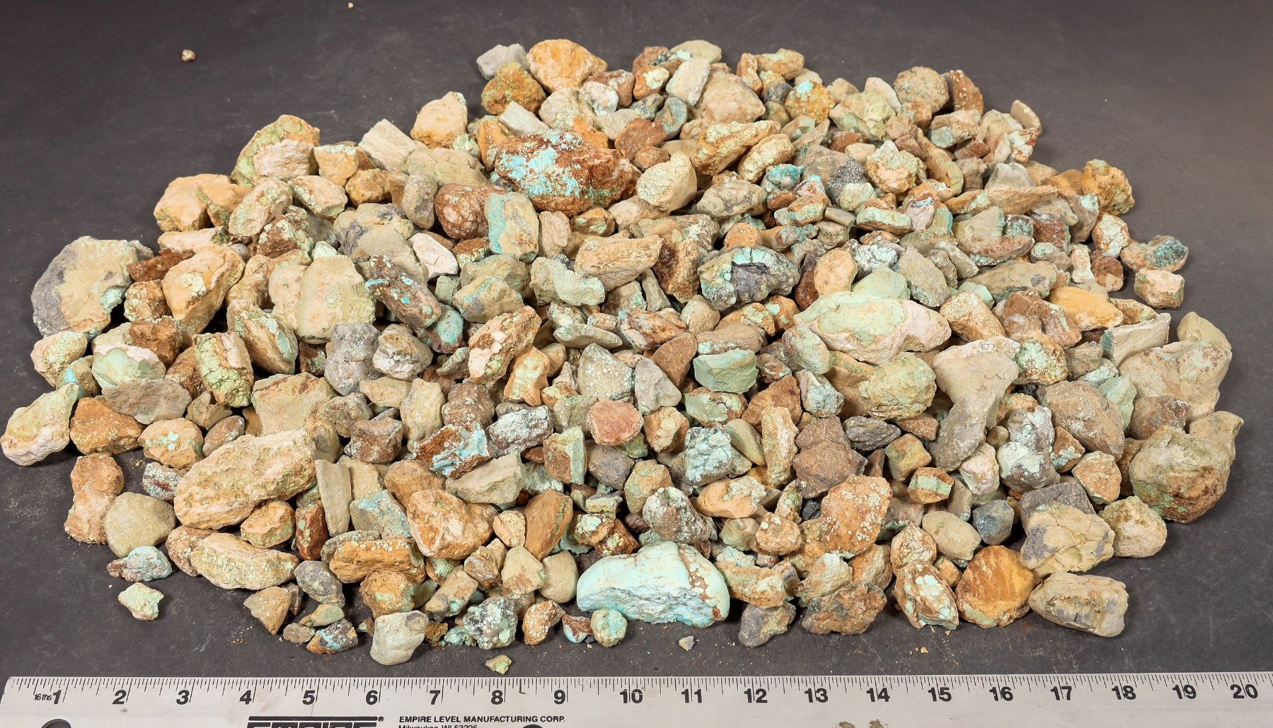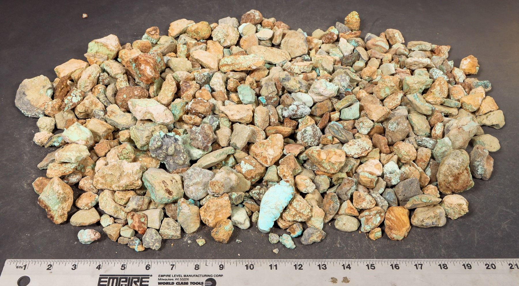 Rough turquoise - small-medium oxidized chunks, light greens and blues/some medium blue, some spiderweb. Untreated. Approximate weight 13.0 pounds. Pieces range from around .5" to 2.5" in length. Decent amount of color variation in this lot; see photos. This turquoise originates from the No. 8 turquoise mine of Cortez, Nevada, often considered one of the top turquoise mines in the world. It was previously in storage for 35 years.
