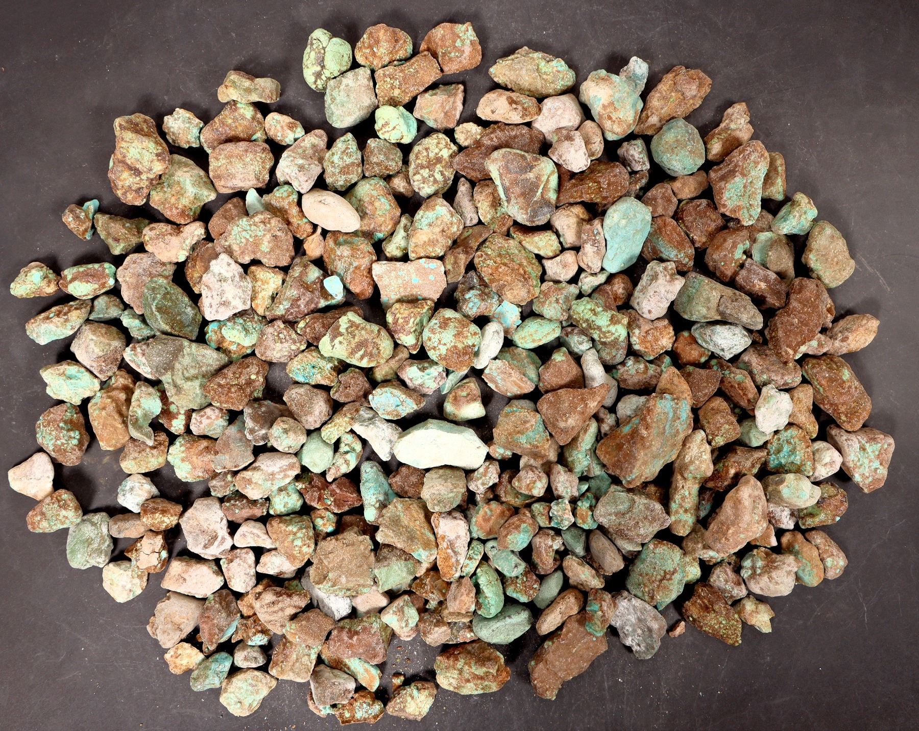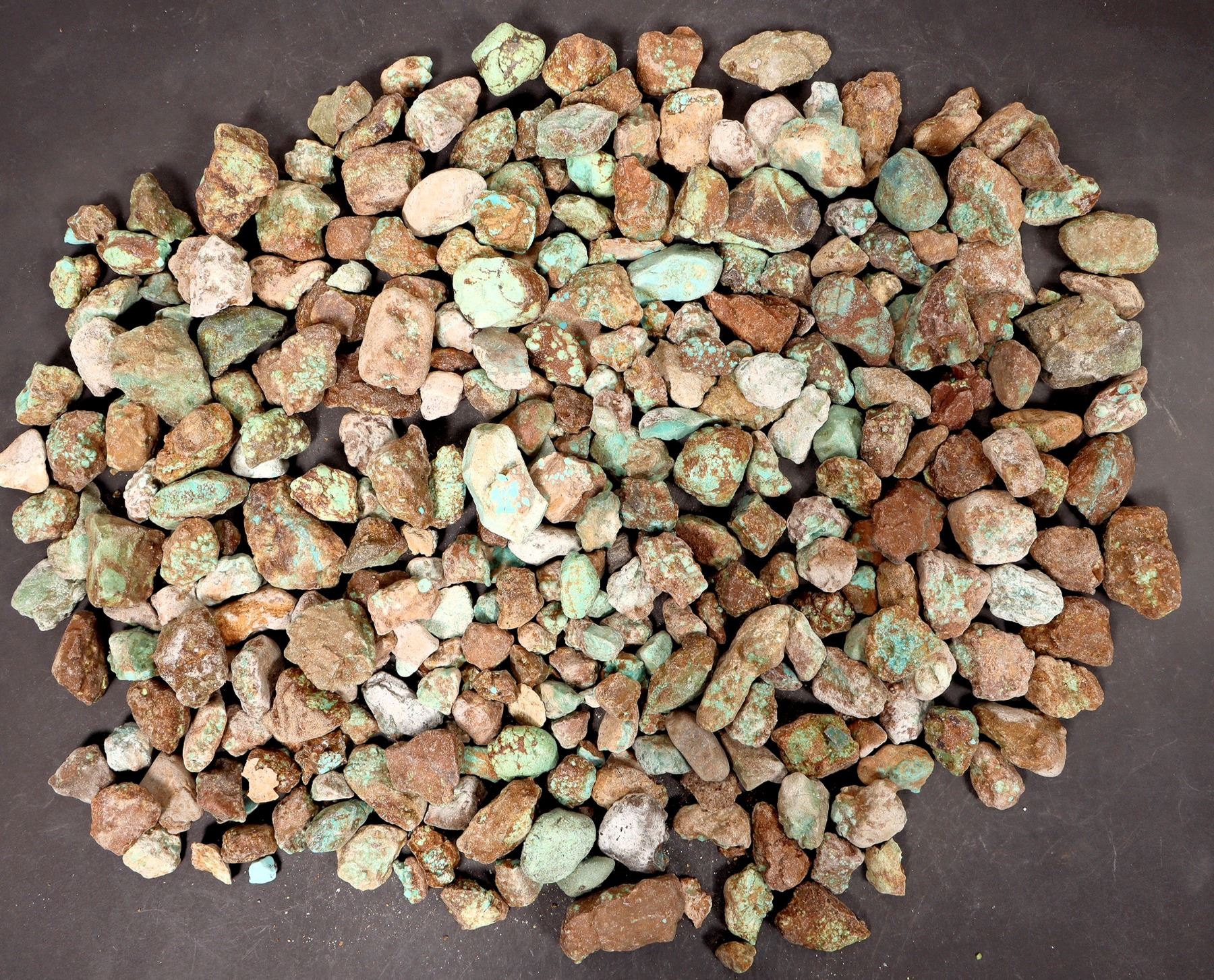 Rough turquoise - small-medium chunks, mostly medium green, mostly treated. Approximate weight 12.4 pounds. Pieces range from around .5" to 2.5" in length. This turquoise originates from the No. 8 turquoise mine of Cortez, Nevada, often considered one of the top turquoise mines in the world. It was previously in storage for 35 years.