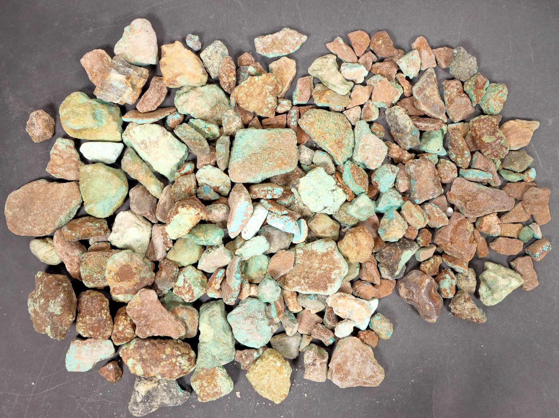 Rough turquoise - mix of cut and uncut pieces, small to medium size, mostly treated, mostly medium greens with some lighter greens and blues. Approximate weight 7.6 pounds. Pieces range from around .5" to 3" in length. Lots of color and size variation in this lot; see photos. This turquoise originates from the No. 8 turquoise mine of Cortez, Nevada, often considered one of the top turquoise mines in the world. It was previously in storage for 35 years.