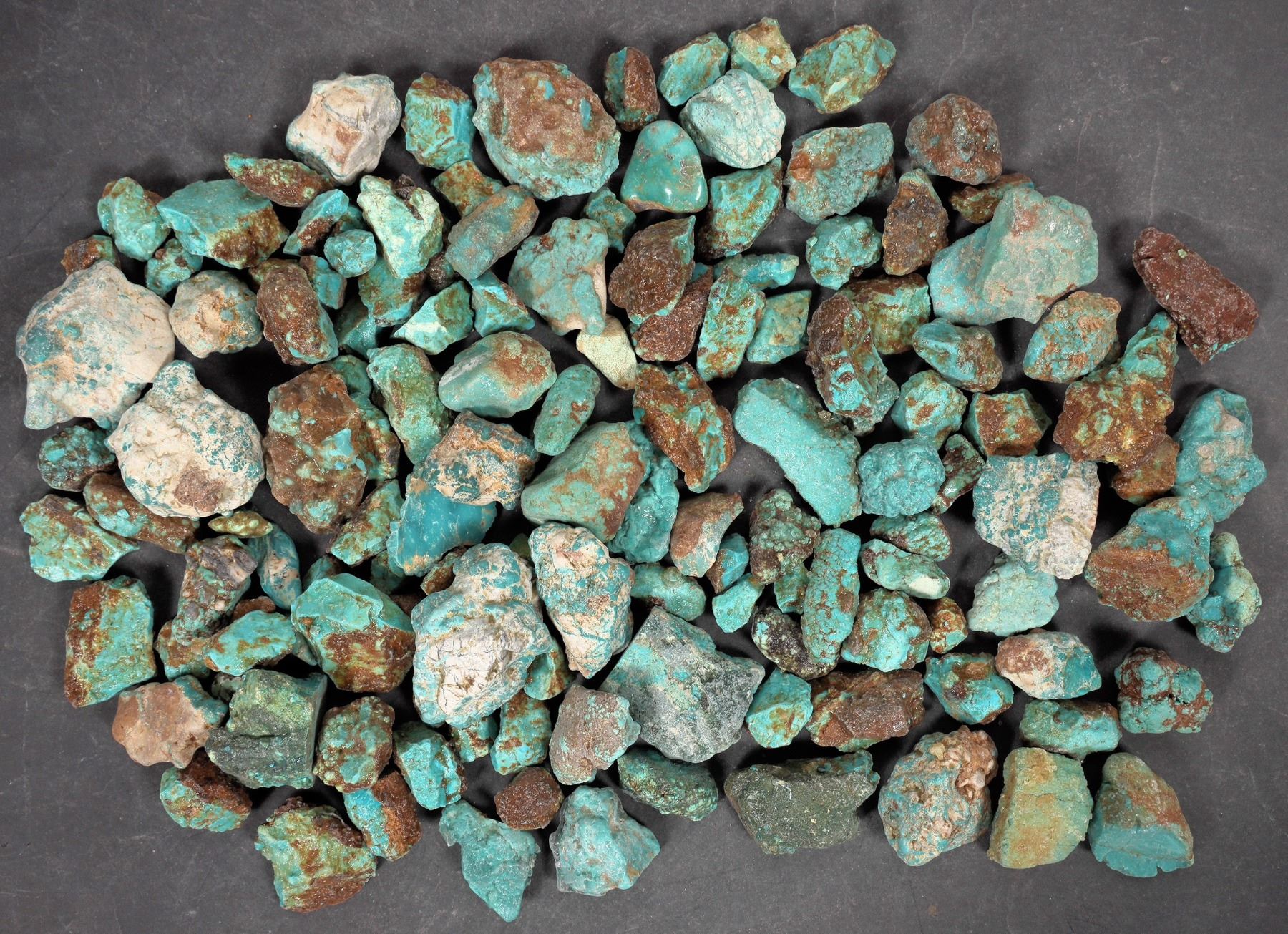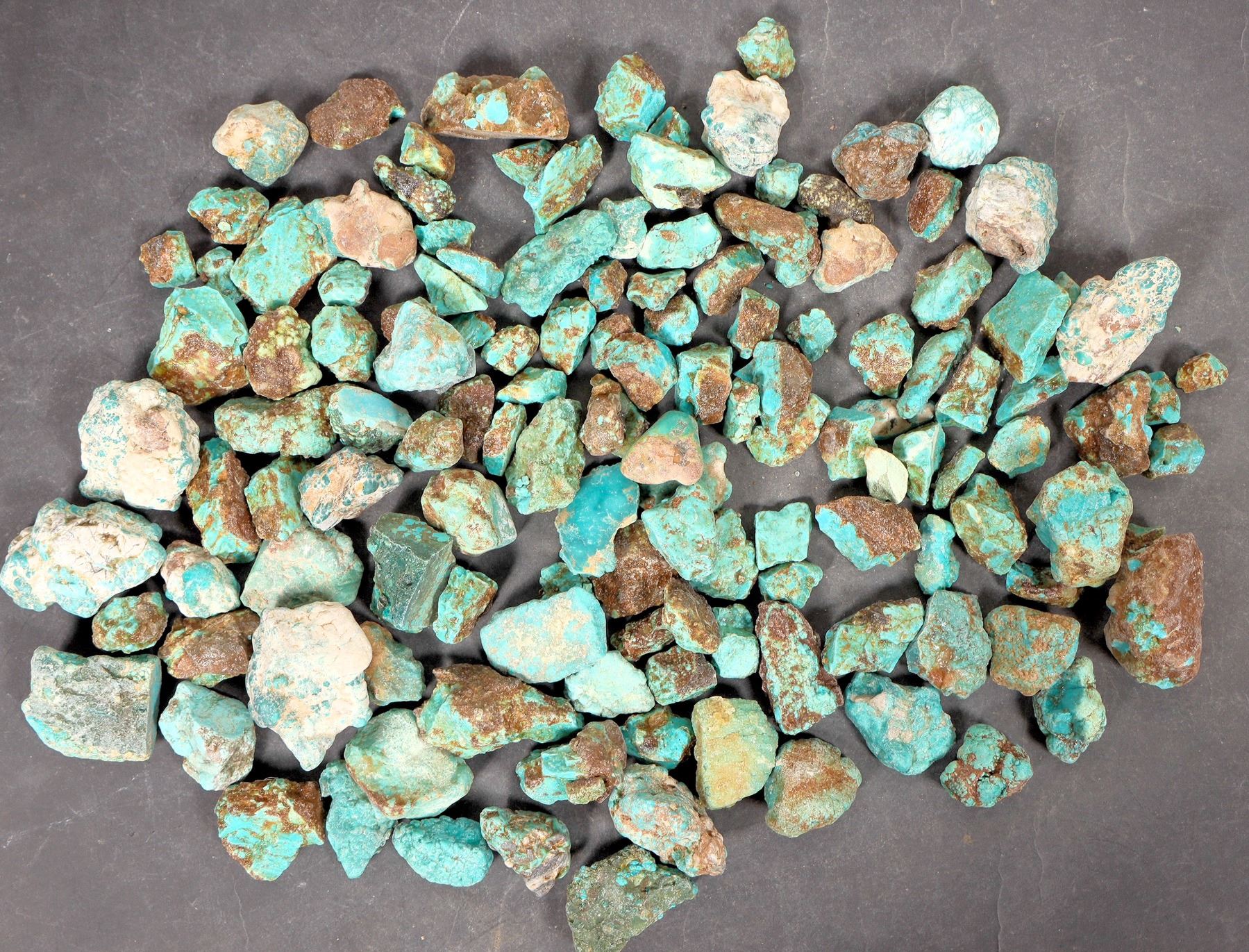 Rough turquoise - small-medium pieces, treated, deep blue in color. Oxidization on some pieces. Approximate weight 4.8 pounds. Pieces in the lot range from around 1" to 2" in length. Excellent color in this lot; see photos. This turquoise originates from the No. 8 turquoise mine of Cortez, Nevada, often considered one of the top turquoise mines in the world. It was previously in storage for 35 years.
