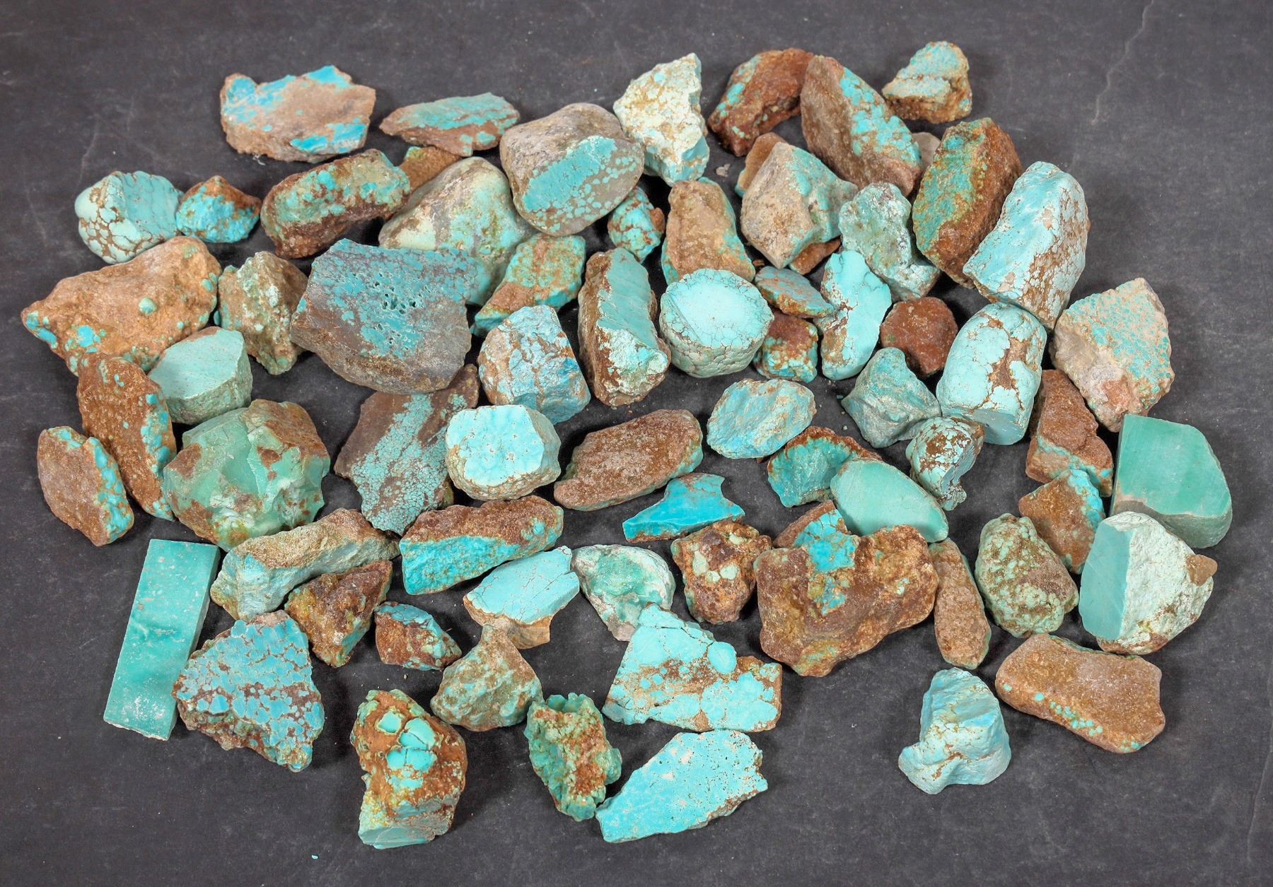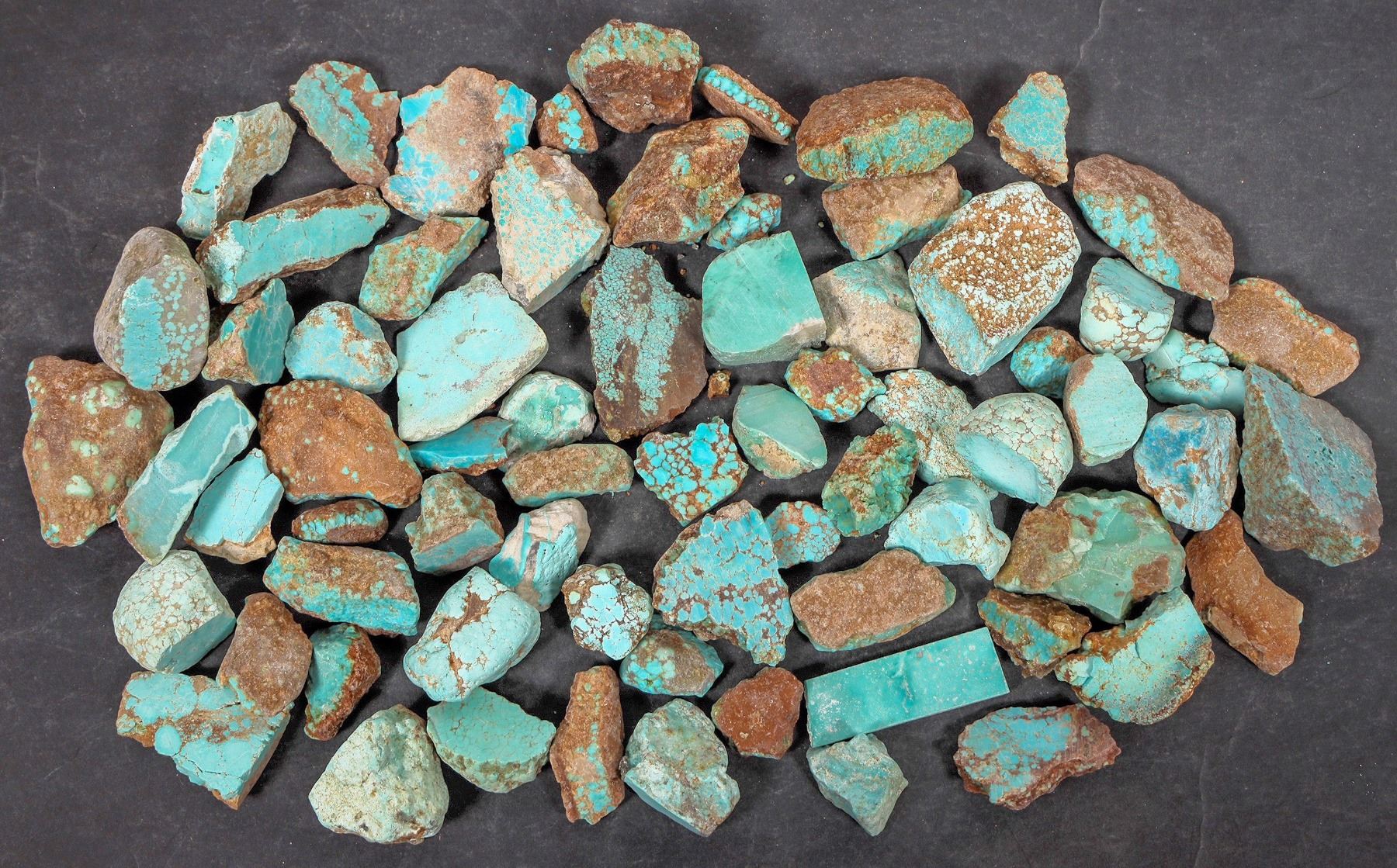 Rough turquoise - small nuggets and pieces, medium blue in color with a few green pieces. Mix of treated and untreated pieces. Approximate weight 1.8 pounds. Pieces in the lot range from around .75" to 2" in length. Nice color; see photos. This turquoise originates from the No. 8 turquoise mine of Cortez, Nevada, often considered one of the top turquoise mines in the world. It was previously in storage for 35 years.