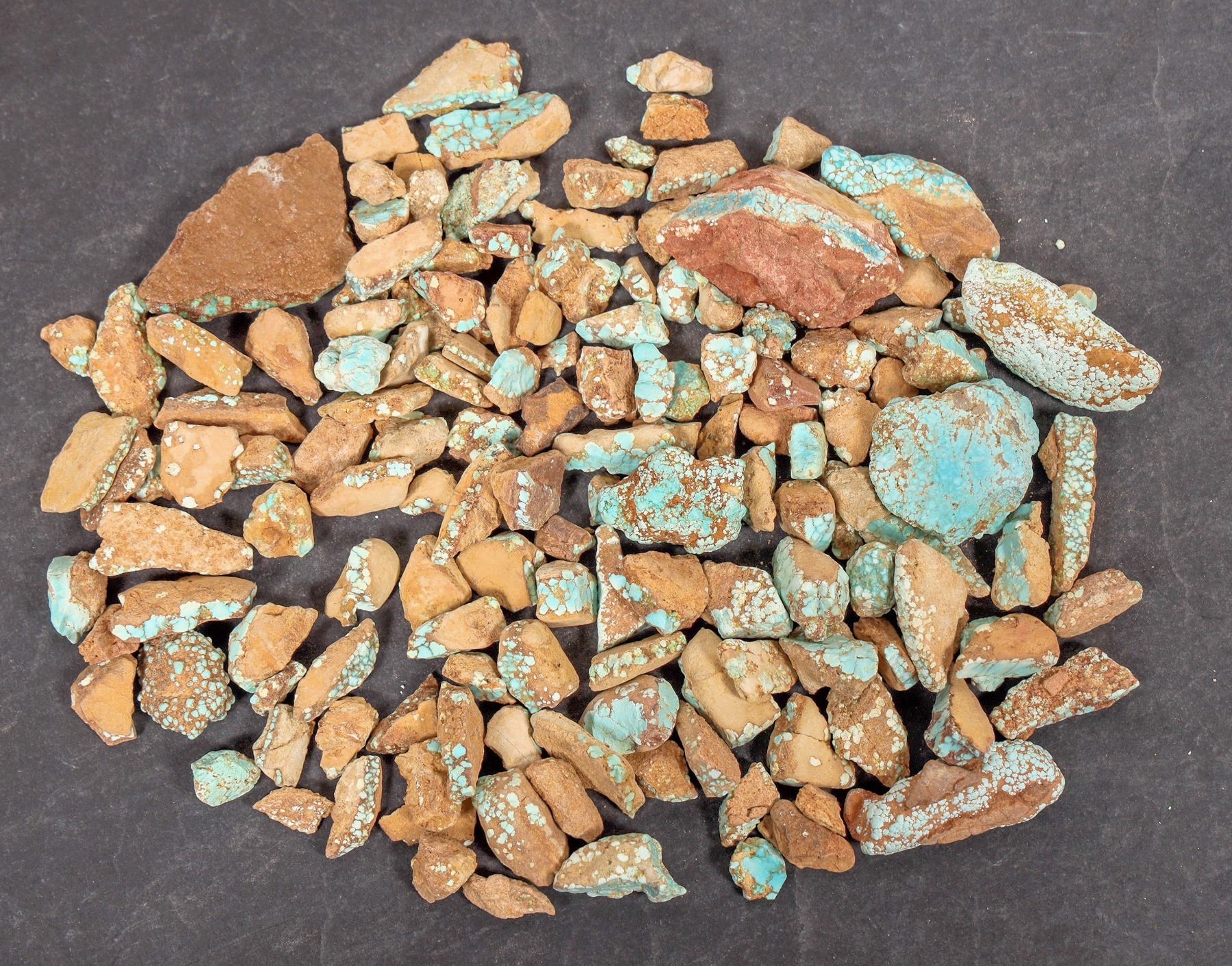 Rough spiderweb turquoise - small pieces, mostly uncut, untreated. Some oxidization, spiderweb matrix pattern. Pale blue in color. Approximate weight 9.0 ounces. Pieces in the lot range from around .25" to 1.5" in length. This turquoise originates from the No. 8 turquoise mine of Cortez, Nevada, often considered one of the top turquoise mines in the world. It was previously in storage for 35 years.