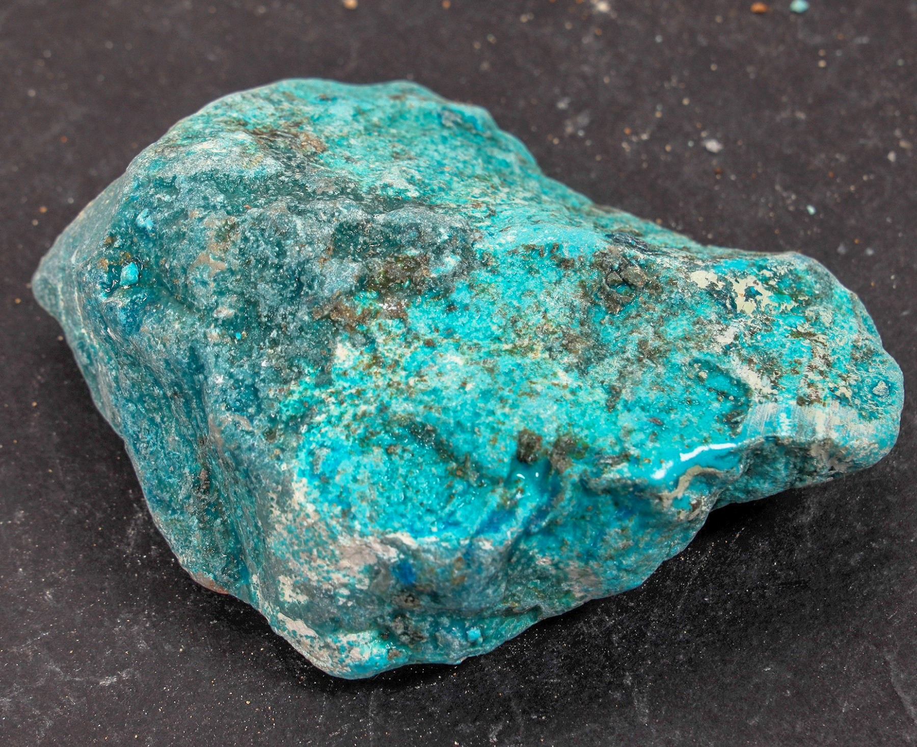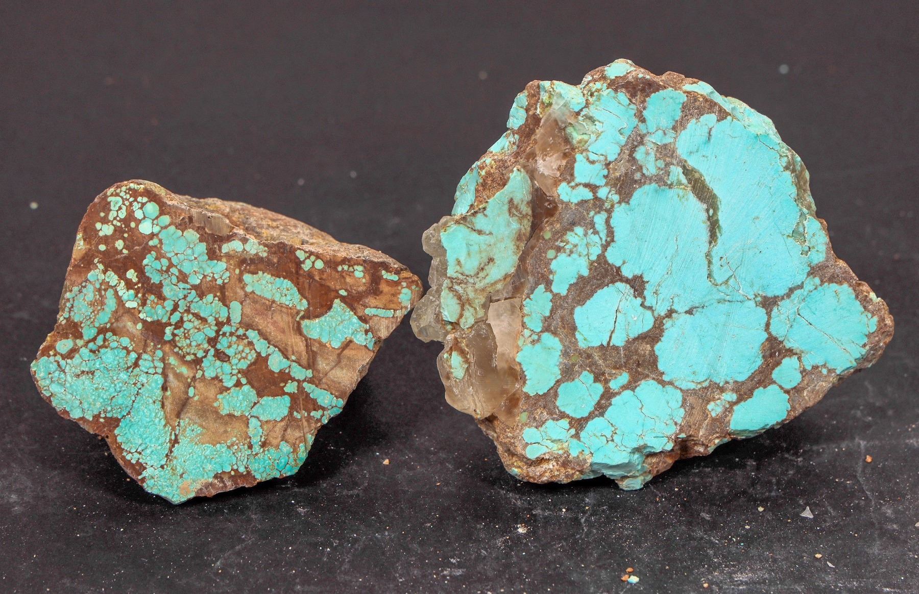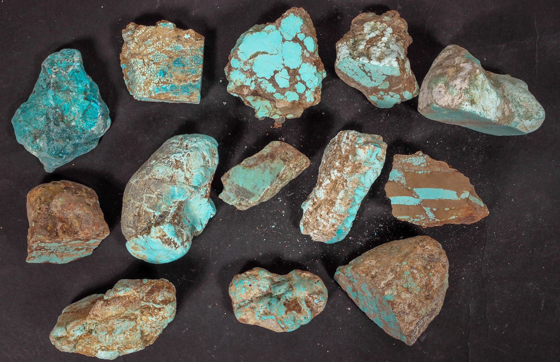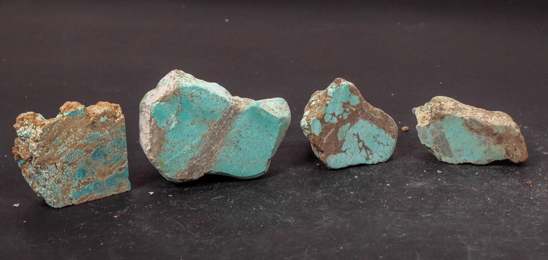 Rough turquoise - large pieces and nuggets, mix of cut and uncut, hand-selected for color. Lot includes medium-light blues and greens. Mix of treated and untreated pieces. Approximate weight 5.4 pounds. Pieces in the lot range from around 3" to 4.25" in length. This turquoise originates from the No. 8 turquoise mine of Cortez, Nevada, often considered one of the top turquoise mines in the world. It was previously in storage for 35 years.