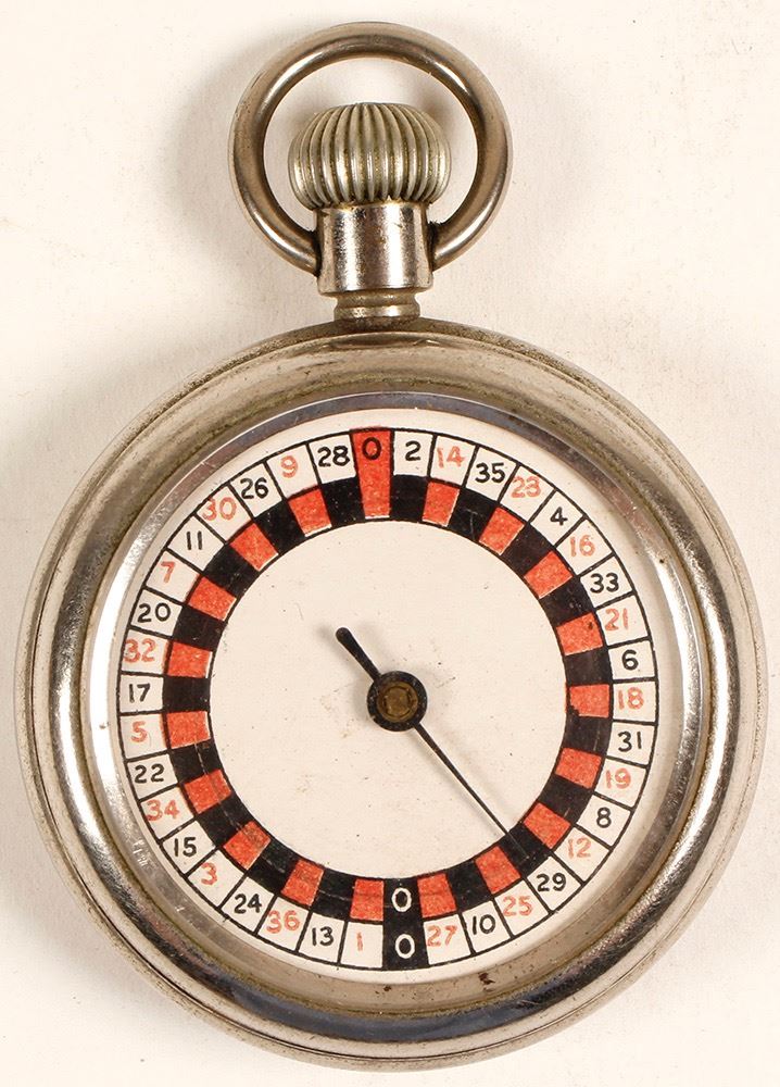 White metal pocket watch with red and black roulette wheel style face. Top winding knob. HWAC# 61844 Date: Location: