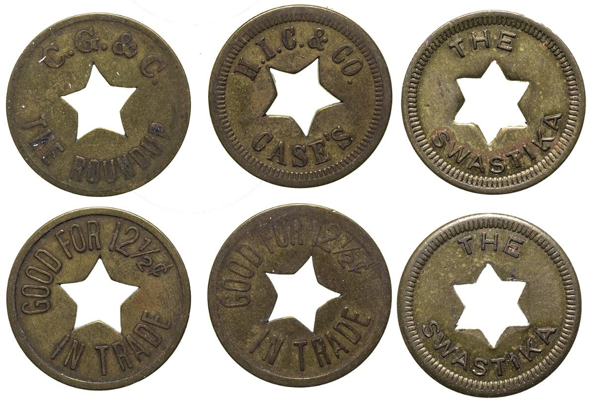 3 Tokens from Roundup Montana with star cut outs, all R-5. The / Swastika // The / Swastika. Round, Brass, Star Cut-Out 21mm. C. G. & C. / The Roundup // GF 12 1/2c / IT. Round, Brass, Star Cut-Out, 21mm. H. I. C. & Co. / Case's // GF 12 1/2c / IT. Round, Brass, Star Cut-Out, 21mm. City: Roundup State: Montana, Date: Inventory# 40128
