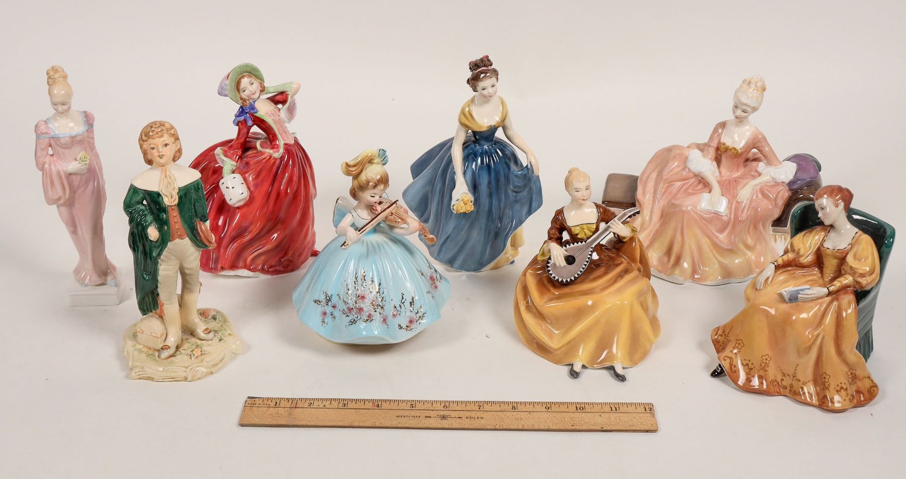 A collection of 8 includes 6 Royal Doulton fine porcelain figurines, made in England, c1960s-70s. This group features larger size pieces between 6.5" and 8" tall and mostly 5" to 8" at base. The lot includes: Symphony, Romance, Reverie, Autumn Breezes, Melanie and Daphne. All Royal Doulton figurines are in excellent condition. 2 others are included that are not Royal Doulton. The Royal Doulton company began in 1815 by John Doulton who invested his life savings, £100, in a small London pottery operation. The company became popular through innovation of new materials and glazing techniques, to collaborating from the beginning with artists and designers, and focusing on educating and empowering women. In the course of 200 years, their wide variety of wares and figurines became highly collectible the world over. Royal Doulton is still in business today. (royaldoulton.com)