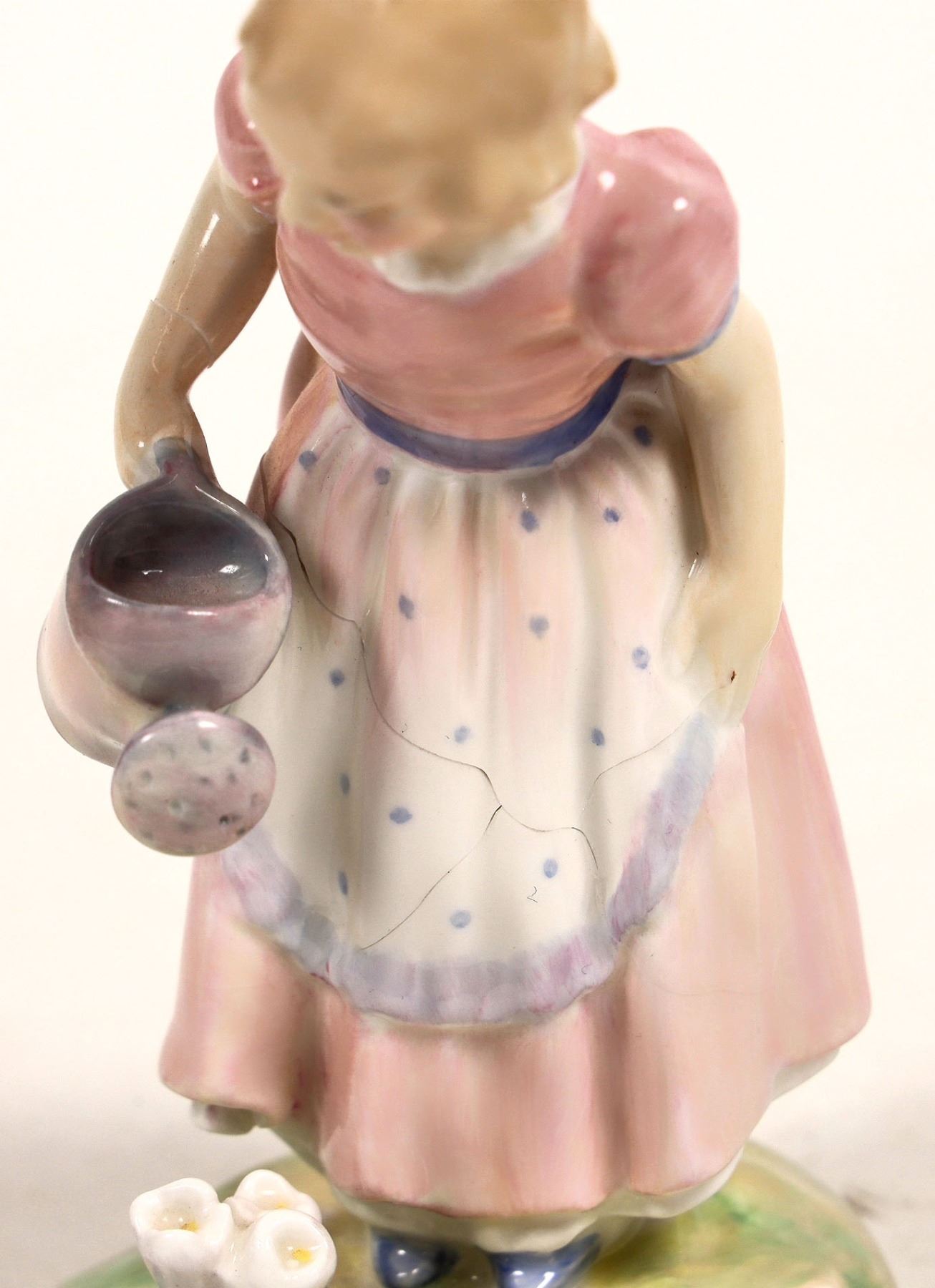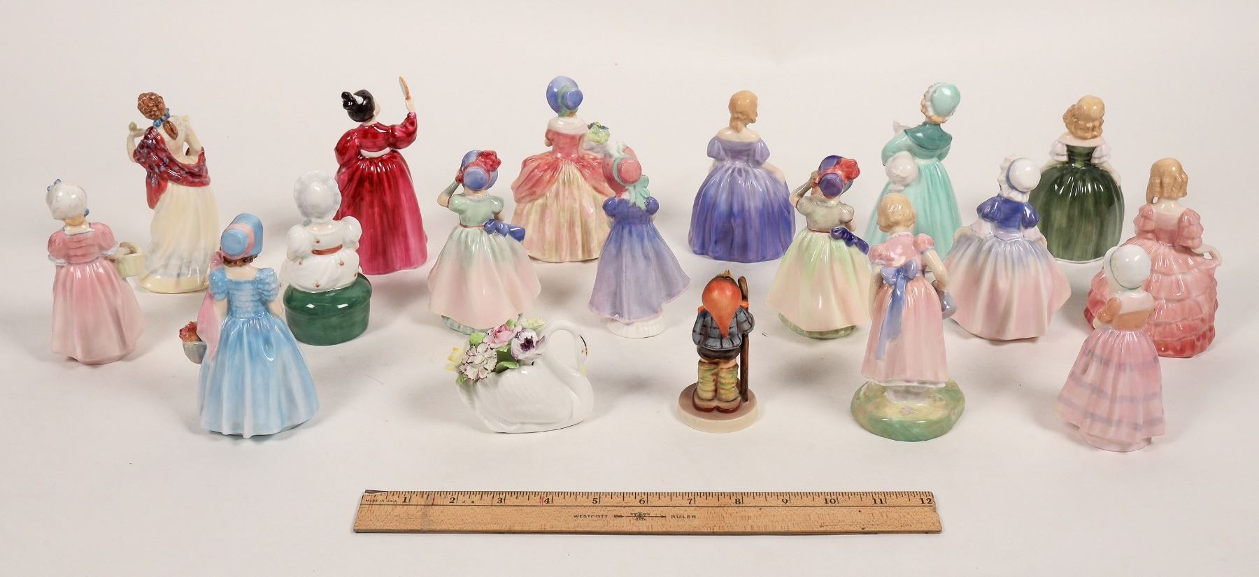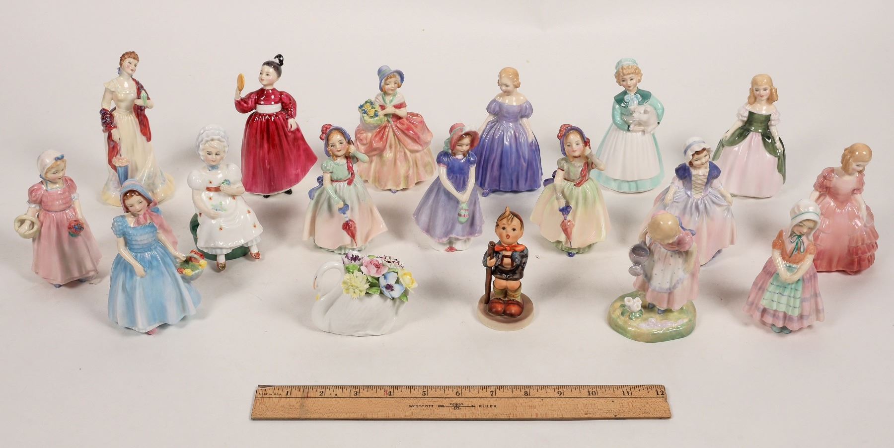 A collection of 18 includes 17 Royal Doulton fine porcelain figurines, made in England, c1940s-60s, and 1 M.I. Hummel figurine. Many are not marked with a date. This group features pieces up to 6" tall. Royal Doulton figurines include: Penny, Tinkle Bell, Wendy, Cissie, Ivy, Marie, Babie (2), Rose, Kathy, Mary Mary, Stayed at Home, Vanity, Dinky Do, Tootles, and Esmeralda. Also includes an approximate 2" x 3.5" x 2.5" Royal Doulton swan piece with delicate and intricate flowers. The M.I. Hummel figurine, by Goebel, Germany, is a 4" tall little boy singing and holding a walking stick. All figurines are in excellent condition, except Mary Mary, which has cracks forming on the body. The Royal Doulton company began in 1815 by John Doulton who invested his life savings, £100, in a small London pottery operation. The company became popular through innovation of new materials and glazing techniques, to collaborating from the beginning with artists and designers, and focusing on educating and empowering women. In the course of 200 years, their wide variety of wares and figurines became highly collectible the world over. Royal Doulton is still in business today. (royaldoulton.com)
