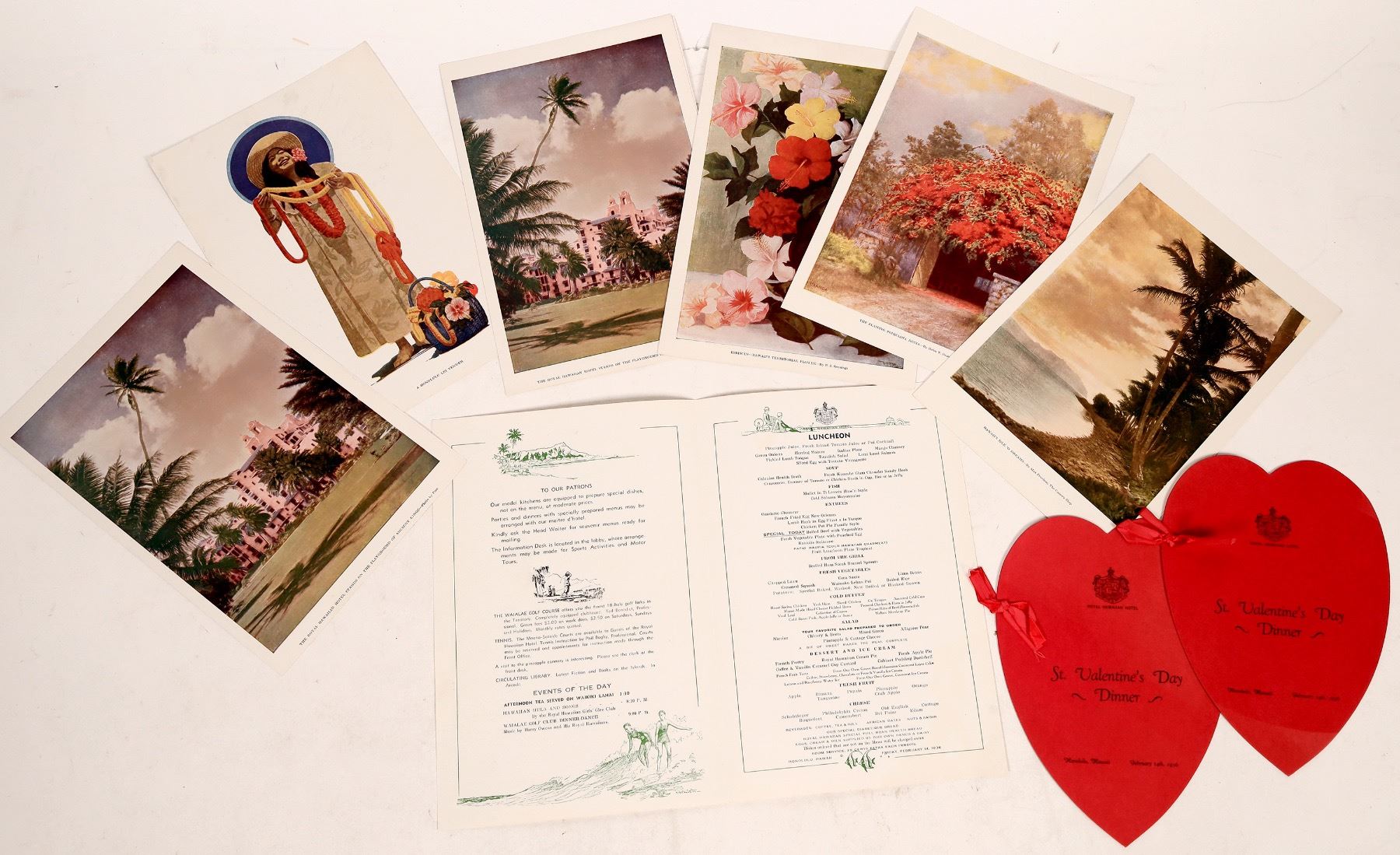 Royal Hawaiian Hotel ephemera, c. 1936. 2 red St. Valentine's Day Dinner invitations, 7 menus with Hawaii scene paintings on covers. "The Royal Hawaiian Hotel is a beachfront luxury hotel located in Waikiki in Honolulu, Hawaii, on the island of Oahu. It is part of The Luxury Collection brand of Marriott International. One of the first hotels established in Waikiki, the Royal Hawaiian is considered one of the most luxurious and famous hotels in Hawaiian tourism, and in its 95-year history has been host to numerous celebrities and world dignitaries. The bright pink hue of its concrete stucco faÁade with its Spanish/Moorish styled architecture and prominent location on the wide sandy beach have earned it the alliterative nickname of "The Pink Palace of the Pacific". from wikipedia Hawaii c.1936