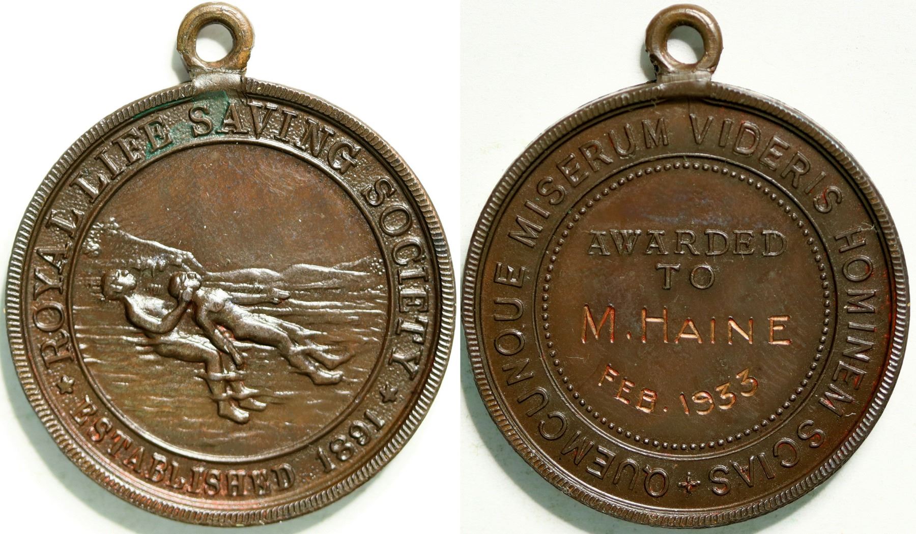 Obv.: Royal Life Saving Society / Established 1891; Rev.: Quemcunque Miserum Videris Hominem Scias / Awarded / To / M. Haine / Feb. 1933. Br., 32 mm. The Society has more than 10,000 members in 48 branches and 350 active lifesaving and lifeguarding clubs it trains over 95% of all pool lifeguards across the UK and Ireland. "Quemcunque miserum videris hominem scias", translates to "Whomever you see in distress, recognize his humanity."