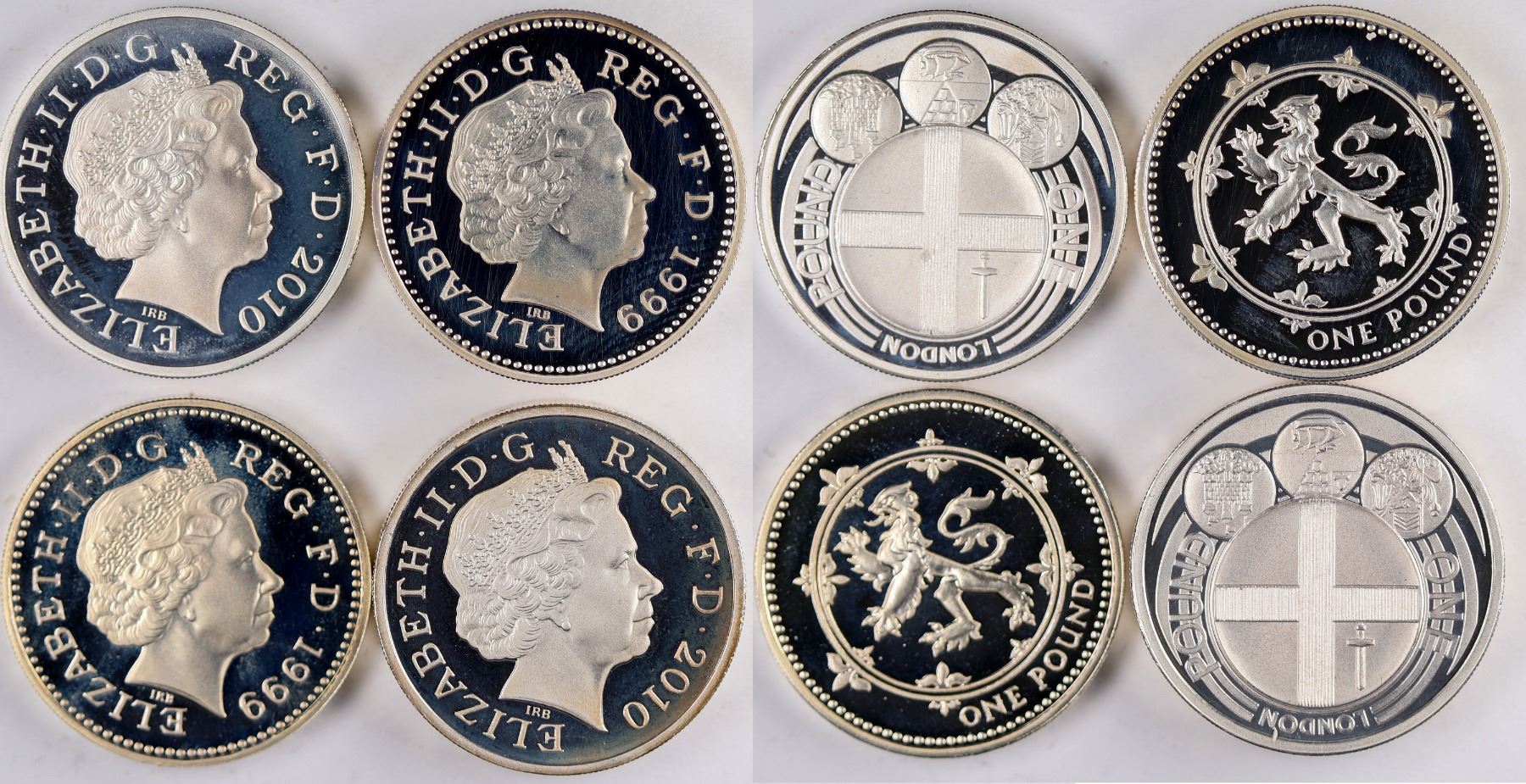 Lot of 4 different, all in original cases. 1) 1999 Silver Proof Piedfort One Pound Coin, 19g, .925, 22.5mm. 2) 1999 Silver Proof One Pound Coin, 9.5g, .925, 22.5mm. 3) 2010 Piedfort Silver Proof One Pound Coin, 19g, .925, 22.5mm. 4) 2010 Silver Proof One Pound, 9.5g, .925, 22.5mm.