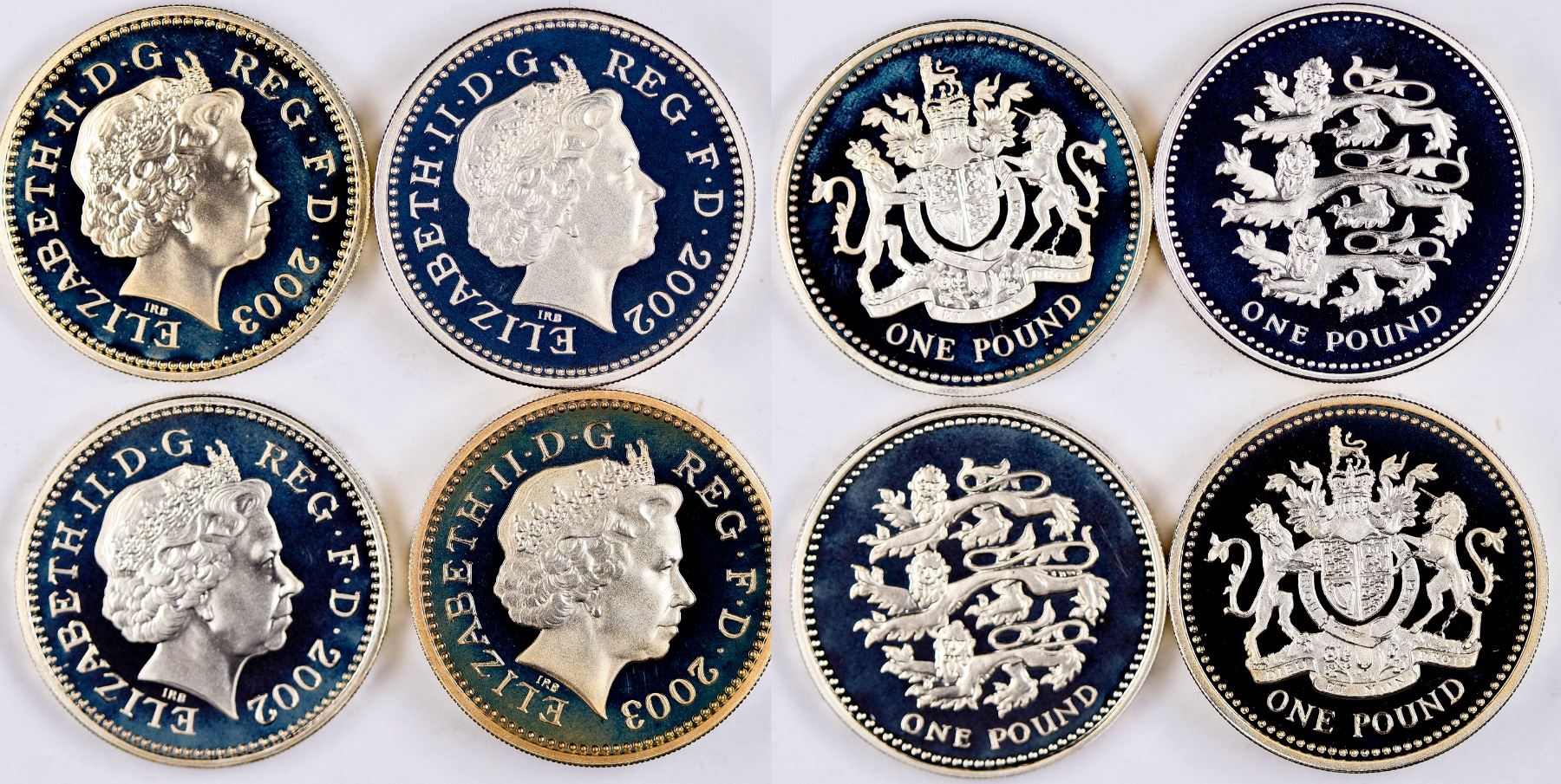 Lot of 4 different, all in original cases. 1) 2002 Silver Piedfort One Pound Coin, 19g, .925, 22.5mm. 2) 2002 Silver Proof One Pound Coin, 9.5g, .925, 22.5mm. 3) 2003 Silver Piedfort One Pound Coin, 19g, .925, 22.5mm. 4) 2003 Silver Proof One Pound Coin, 9.5g, .925, 22.5mm.